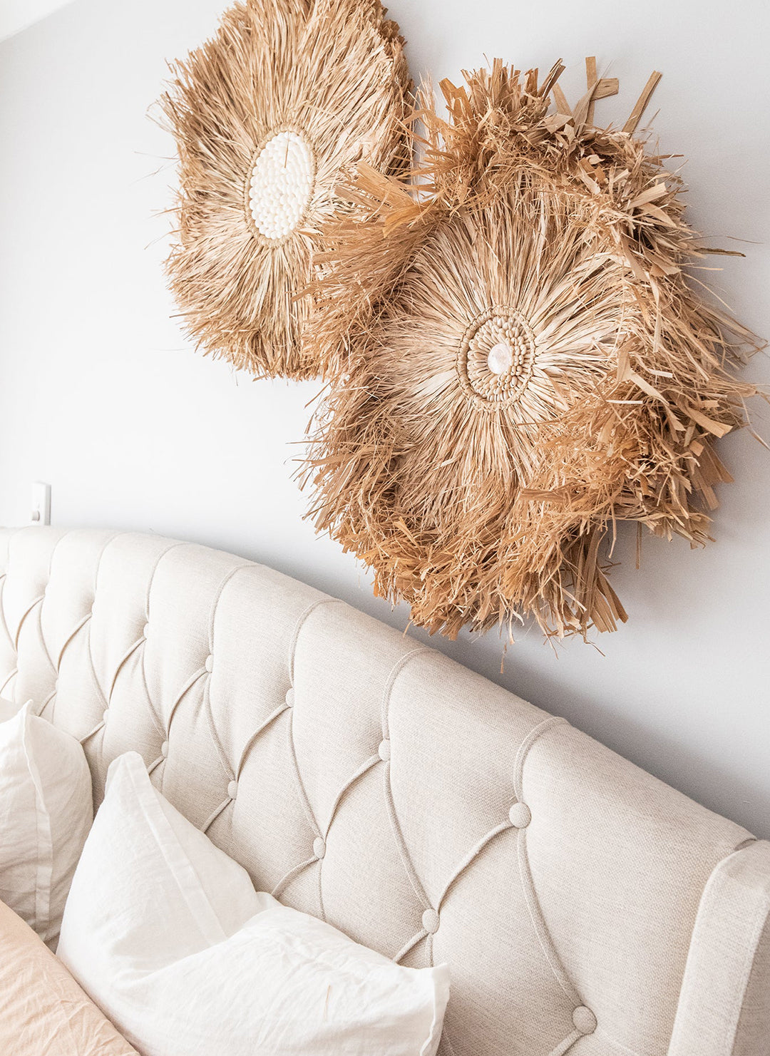Juju hats are surprisingly easy to work with as they quickly add a bit of three-dimensional texture to any wall and can become an exotic focal point of the room. With many colors, jujus can conjure up a rustic, exotic feel or a relaxed, chic one depending on your choice of hue.