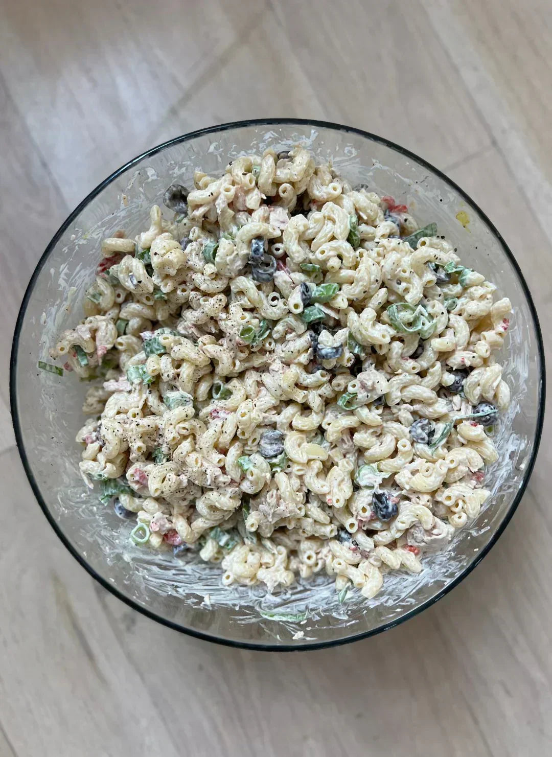 Add the cooled pasta to the dressing and gently toss to coat. Fold in the tuna, green onions, pimentos, and black olives. Mix until evenly distributed.
