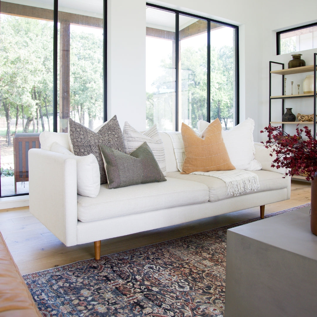 Begin by arranging your solid, neutral pillows to serve as a foundation for your pillow arrangement. You can choose pillows like the Cream Mudcloth and Dash Designer in Sand pillow covers to create a sense of balance. Add a layer of vibrant colors like the Rust Orange or the Tuscany pillow covers to create contrast. The neutral base allows the vibrant pillow covers to shine.
