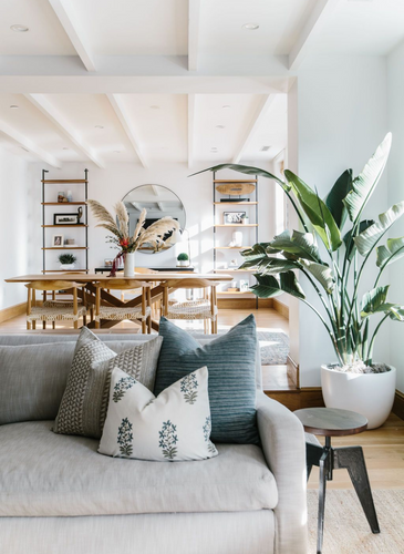 They’ll blend in, preventing you from creating visual depth. Instead, place a throw pillow displaying different shades like white or beige on the back of the couch to create a base for your pillow arrangement. This concept speaks to another basic interior design principle—contrast.