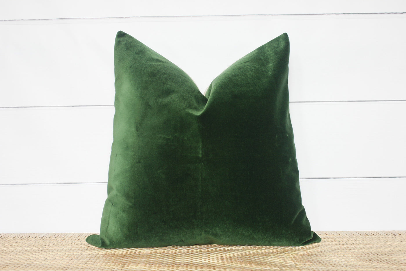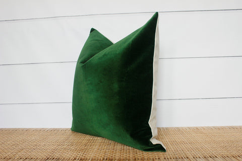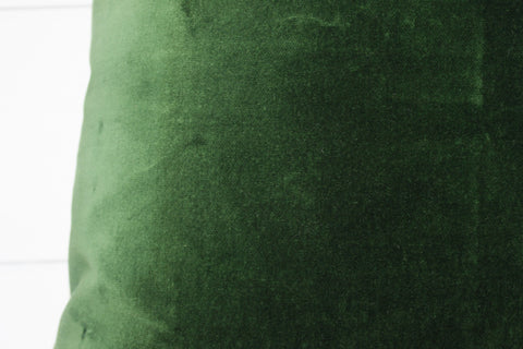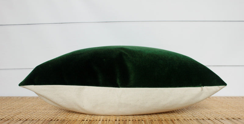 Designer green velvet lumbar pillow in 100% cotton velvet backed with flaxed linen cotton blend.