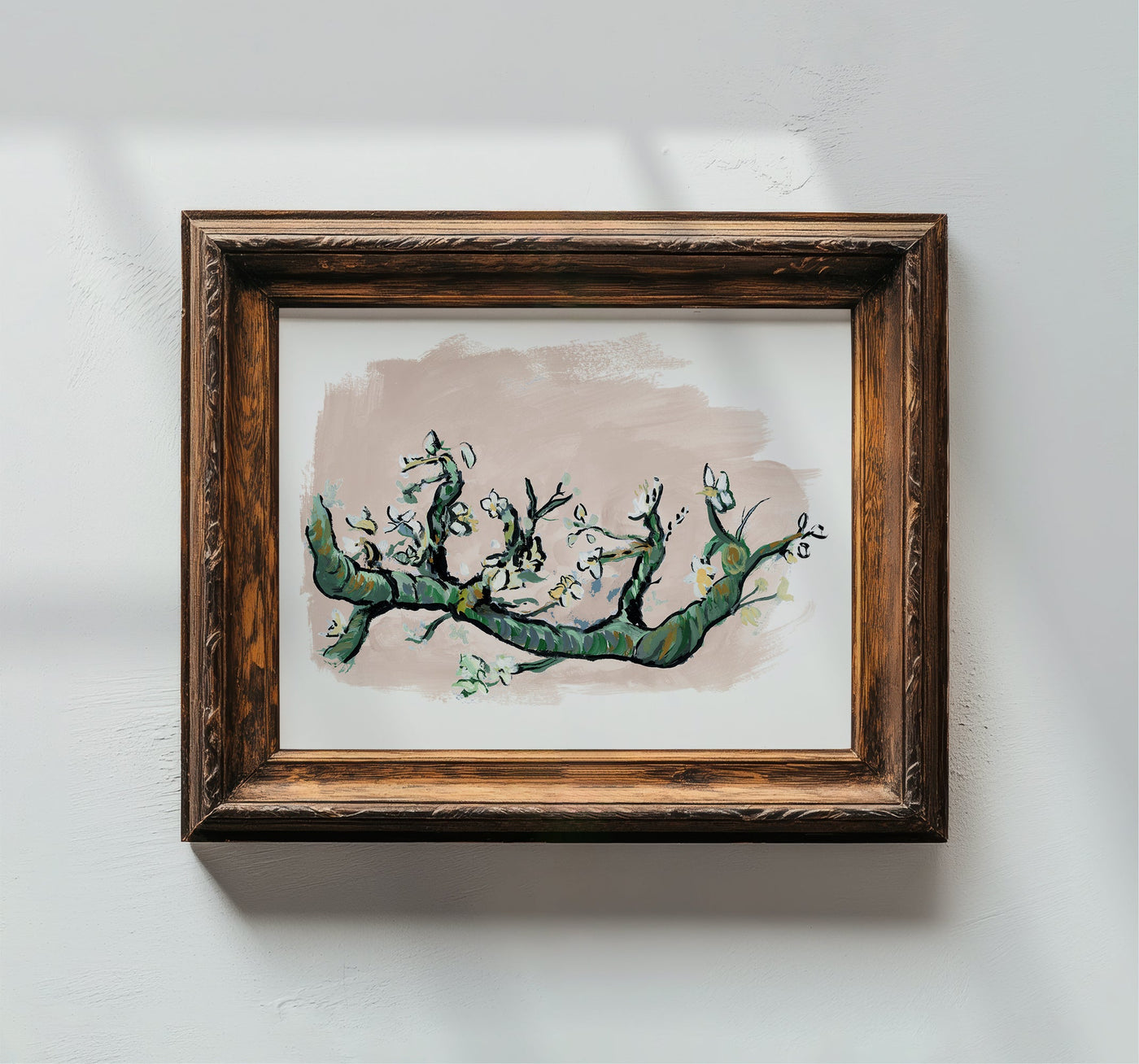 Almond Bloem is a fine art print inspired by the delicate blooms of the almond tree, a symbol of renewal and beauty. The composition highlights blossoms in soft tones set against grounding hues, bringing together natural detail and painterly texture. Its serene presence makes it ideal for bedrooms, living rooms, or gallery wall arrangements.