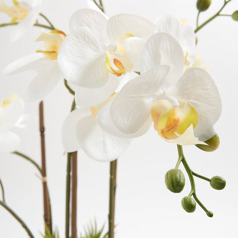 Bring tropical charm into your home with this stunning 24" Artificial Orchid with Succulents arrangement. Featuring delicate white orchid blooms paired with lush green succulents, it captures the layered beauty of the tropics while adding elegant texture to your space. Perfect for elevating a dining table, console, or windowsill, it creates a natural focal point without the hassle of upkeep.