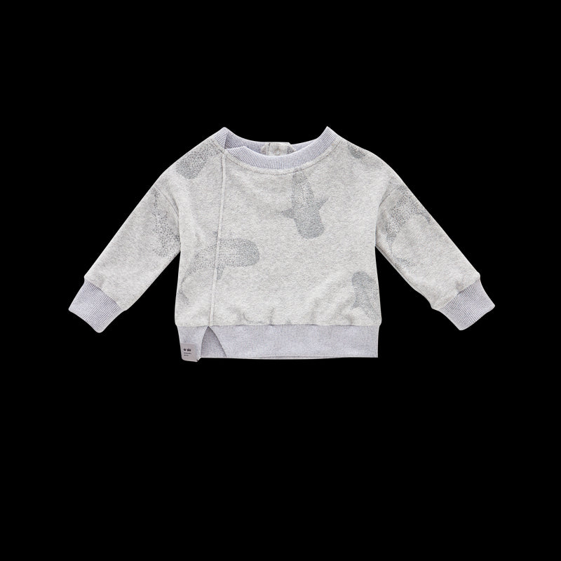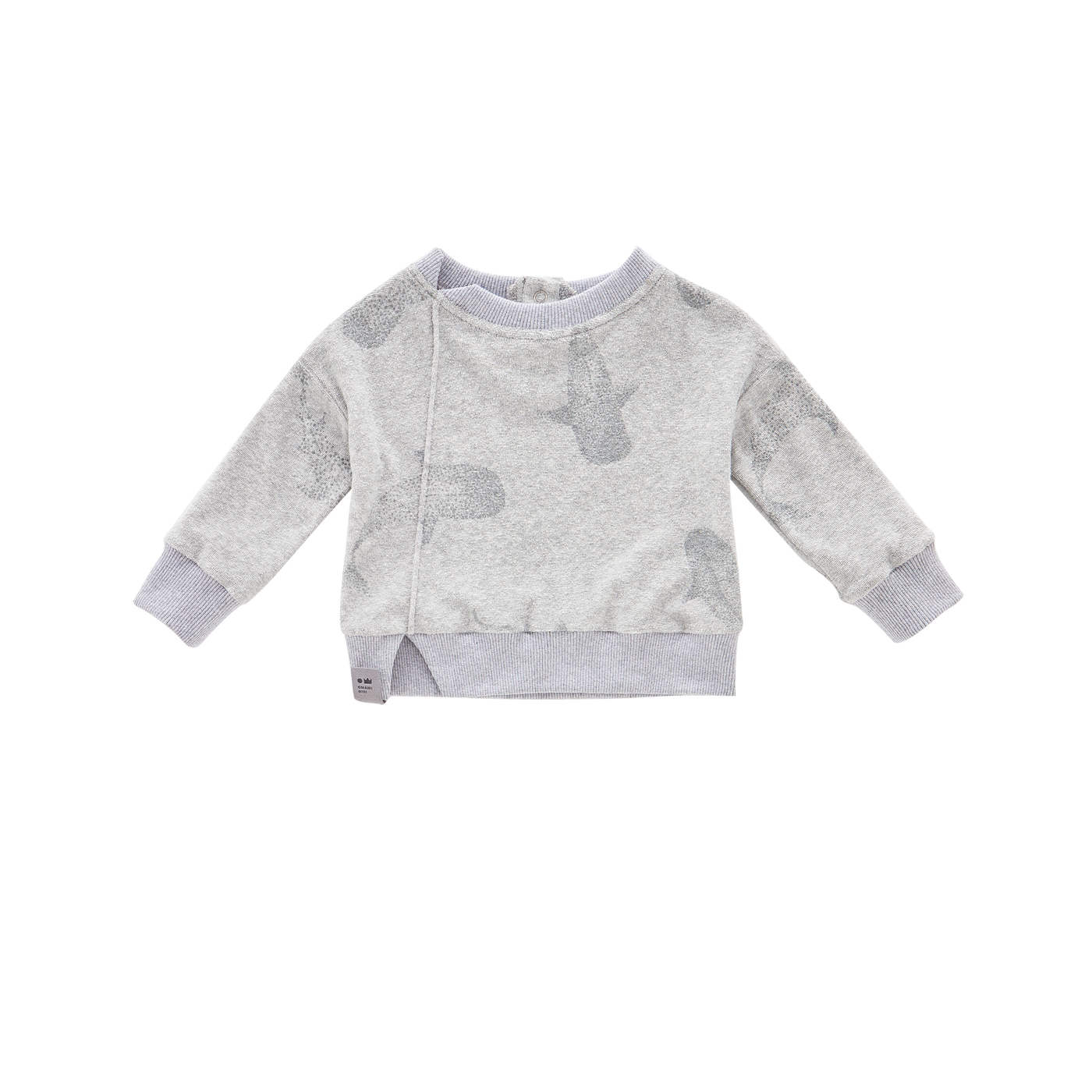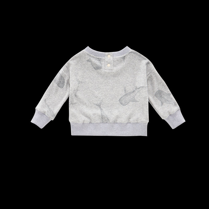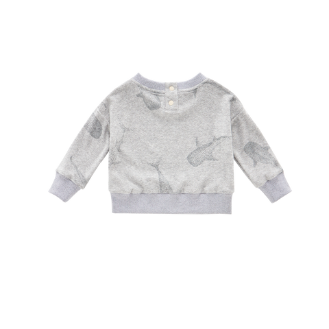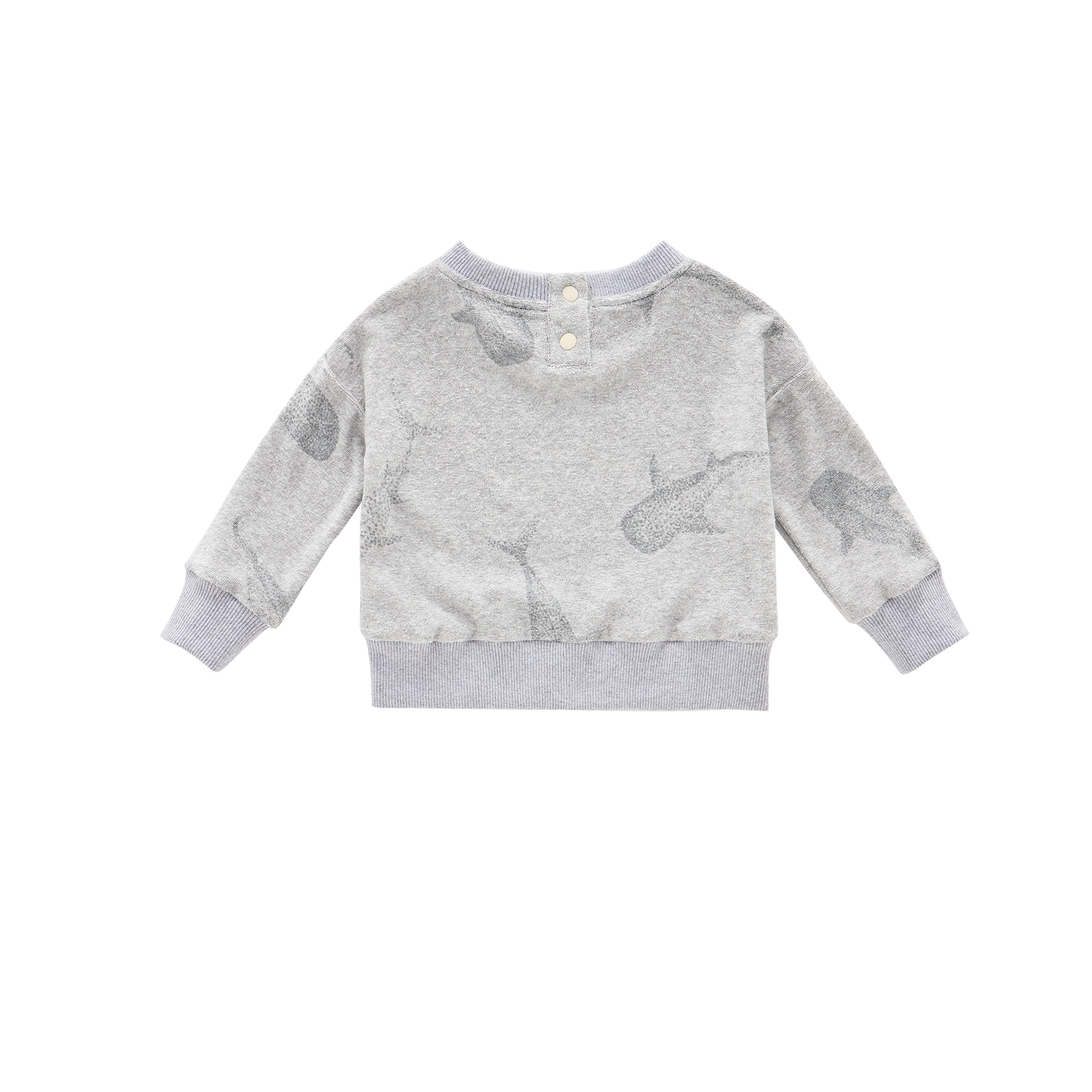 This pullover terry cloth sweatshirt has a relaxed, gender neutral fit and a cool diagonal seam detail with split end on crewneck and hem. Perfect for slightly cooler summer nights. Whale sharks tonal print for added awesomeness!