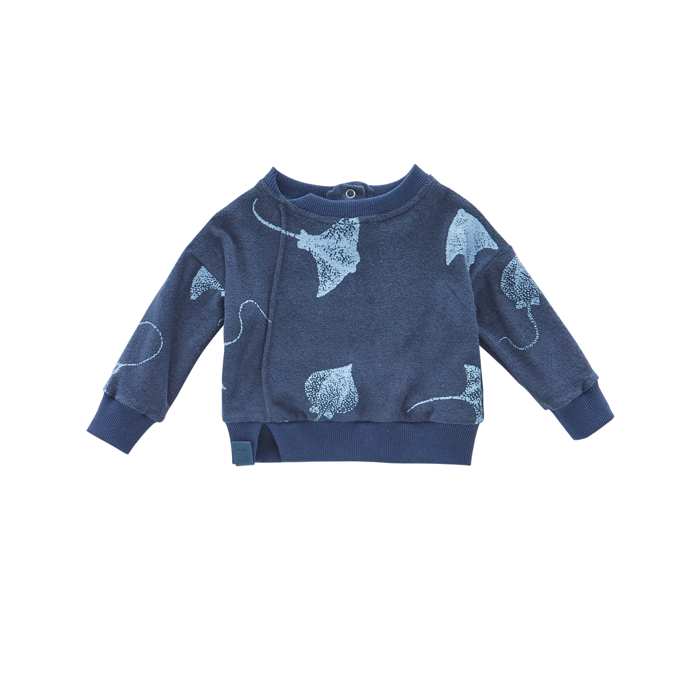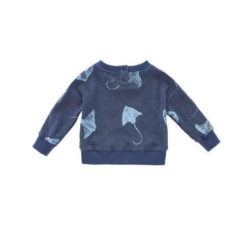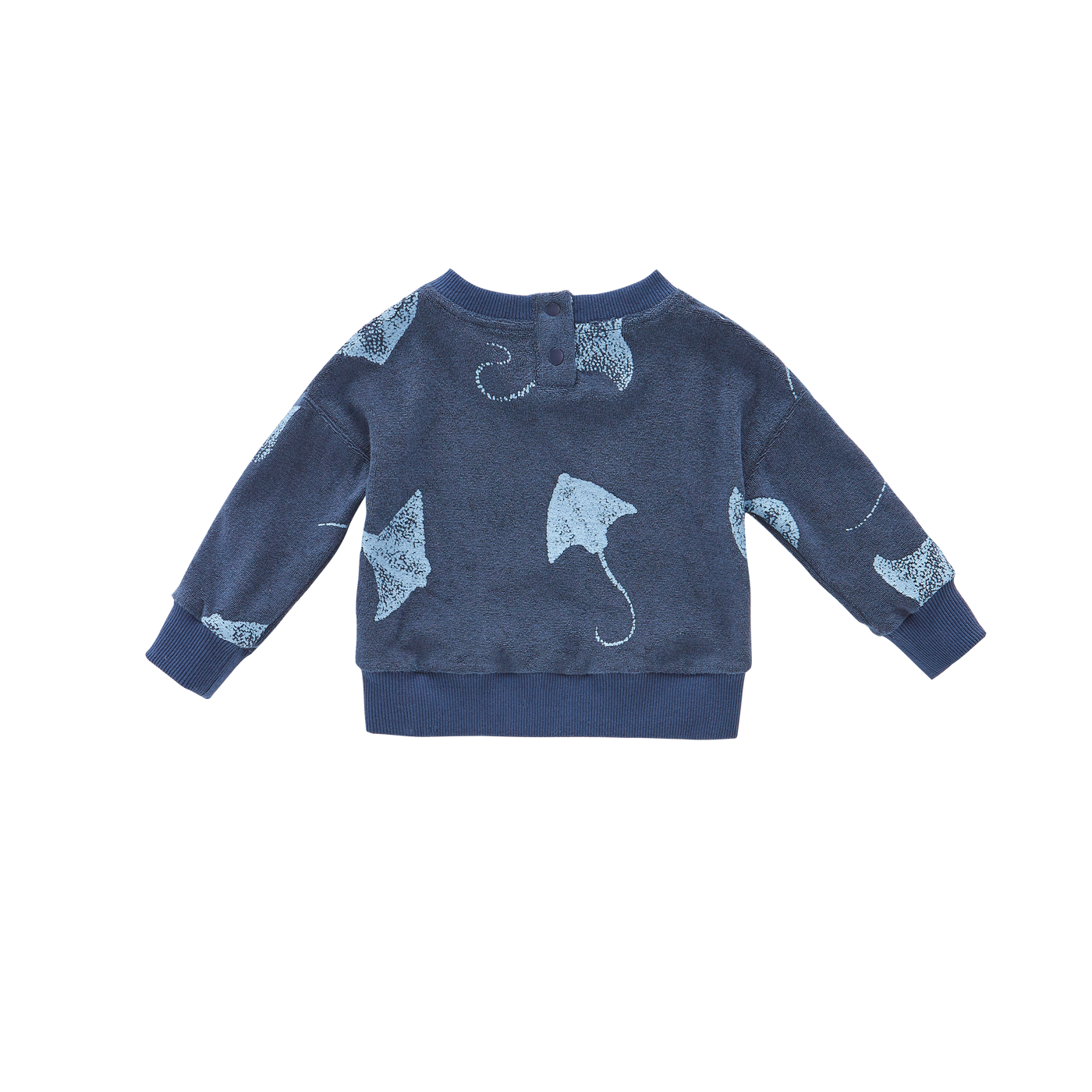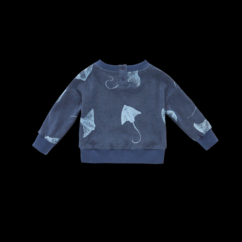 This pullover terry cloth sweatshirt has a relaxed, gender neutral fit and a cool diagonal seam detail with split end on crewneck and hem. Perfect for slightly cooler summer nights. Manta Rays tonal print for added awesomeness!