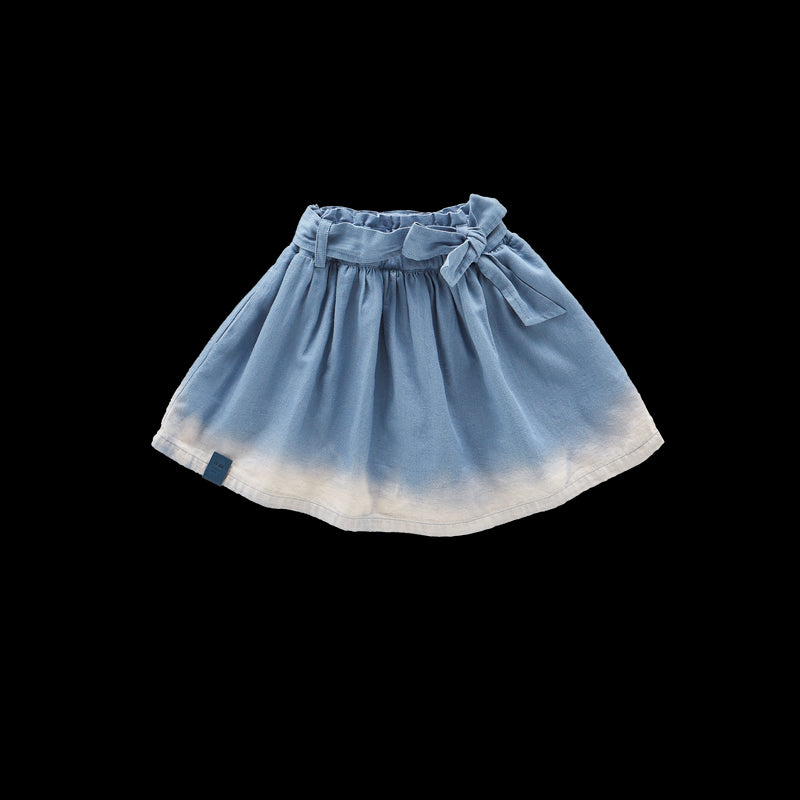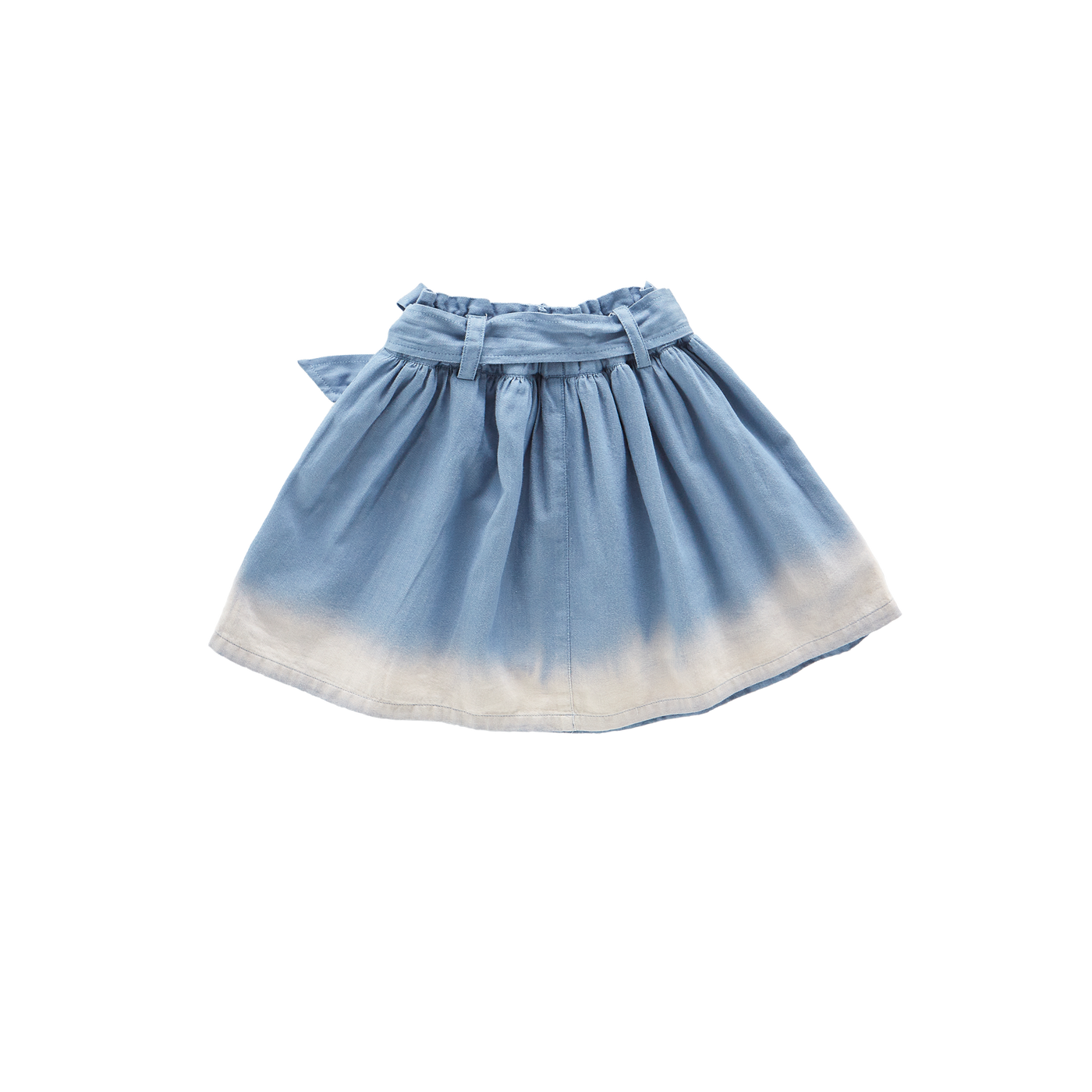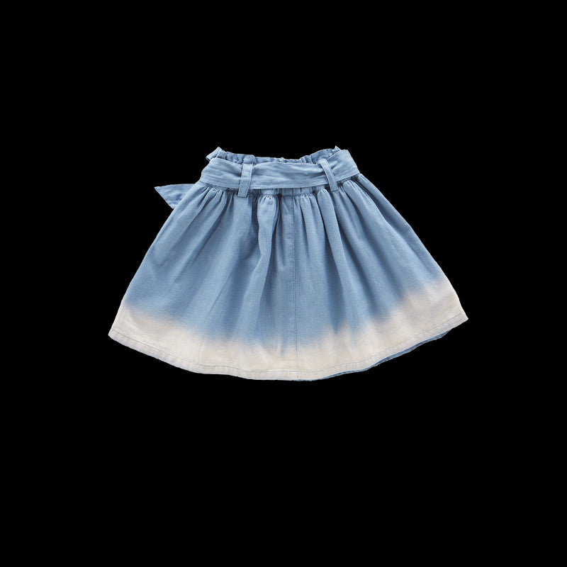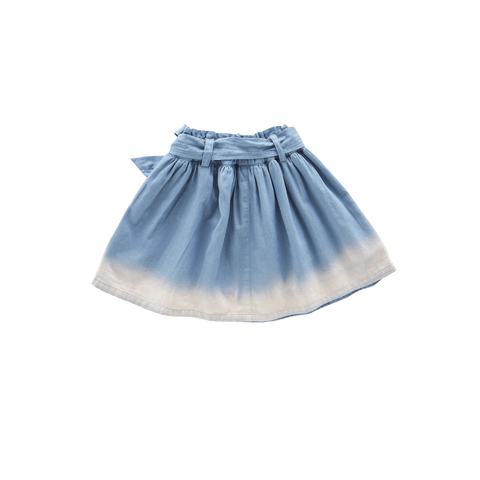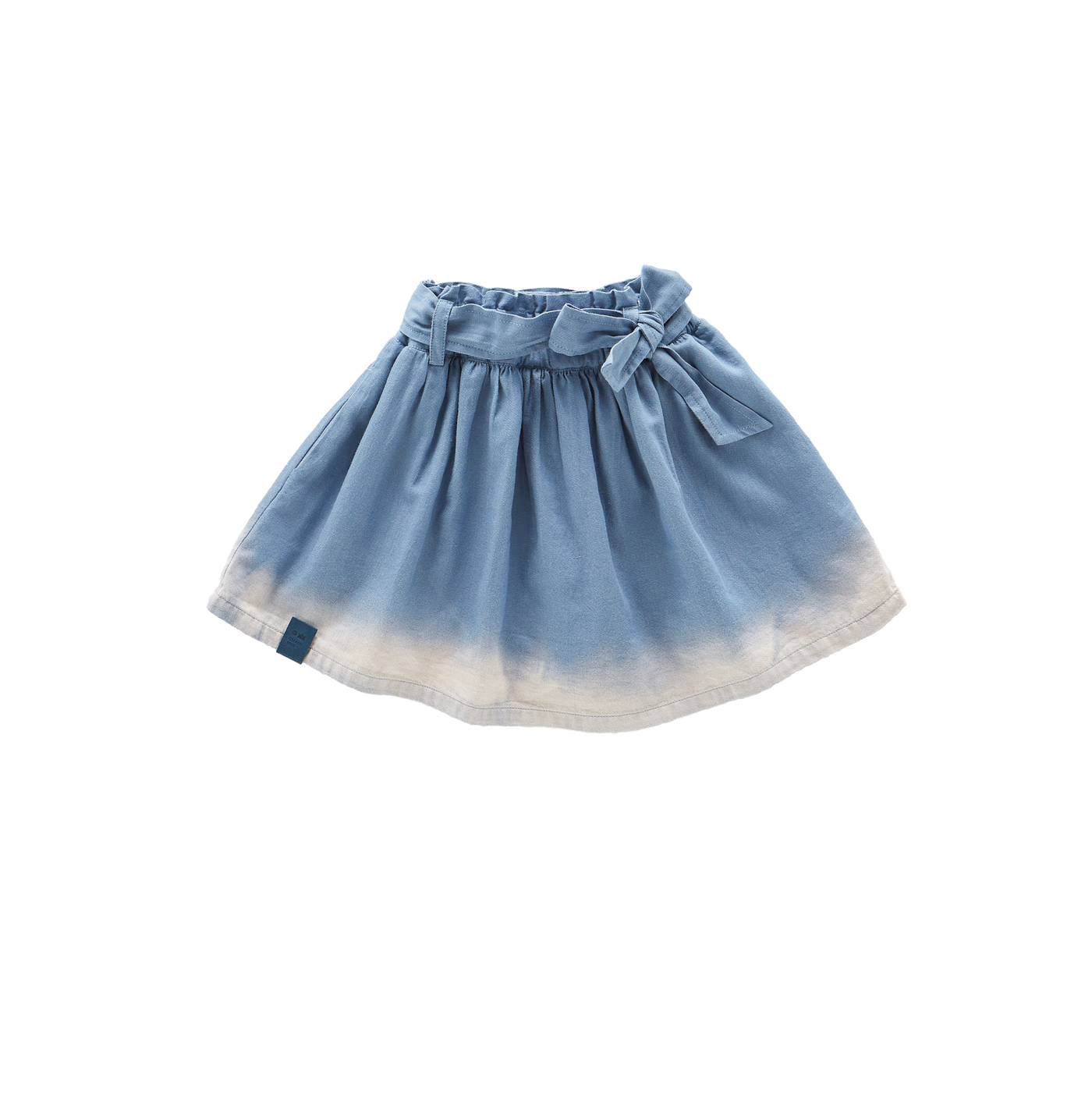 This skirt in super soft, dip-bleached chambray fabric features an elasticized waistband with a tie belt and comfy in-seam side pockets. We like the tie on a side but you do you!