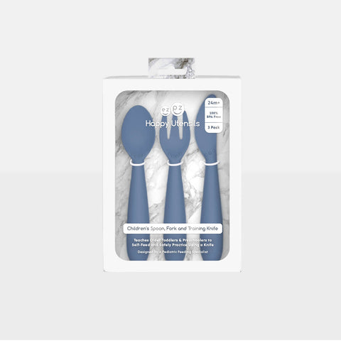 Encourage confident and independent eating with the Happy Utensils by ezpz. Thoughtfully designed for older toddlers and preschoolers, this set helps children master spoon and fork use while safely introducing knife skills like spreading and cutting.