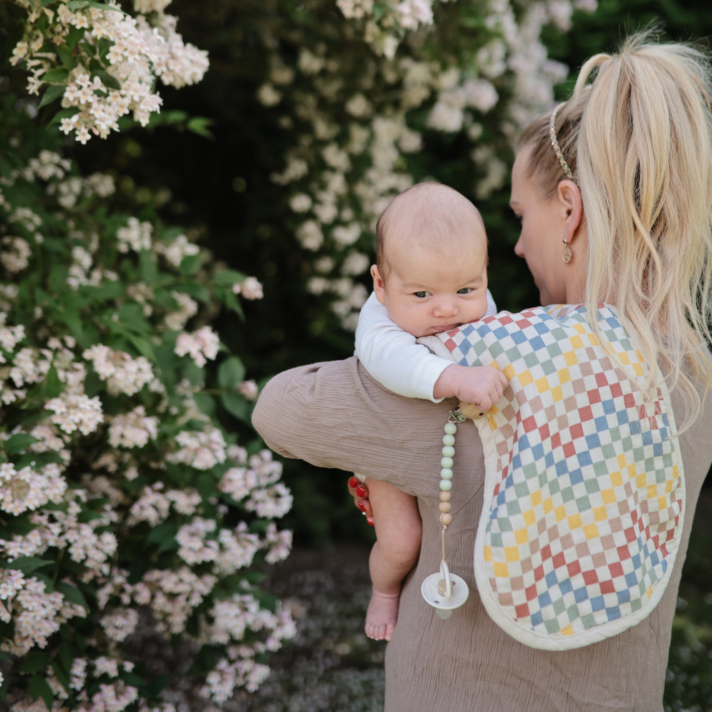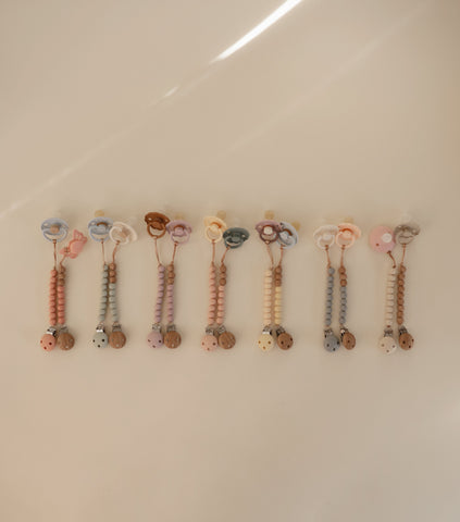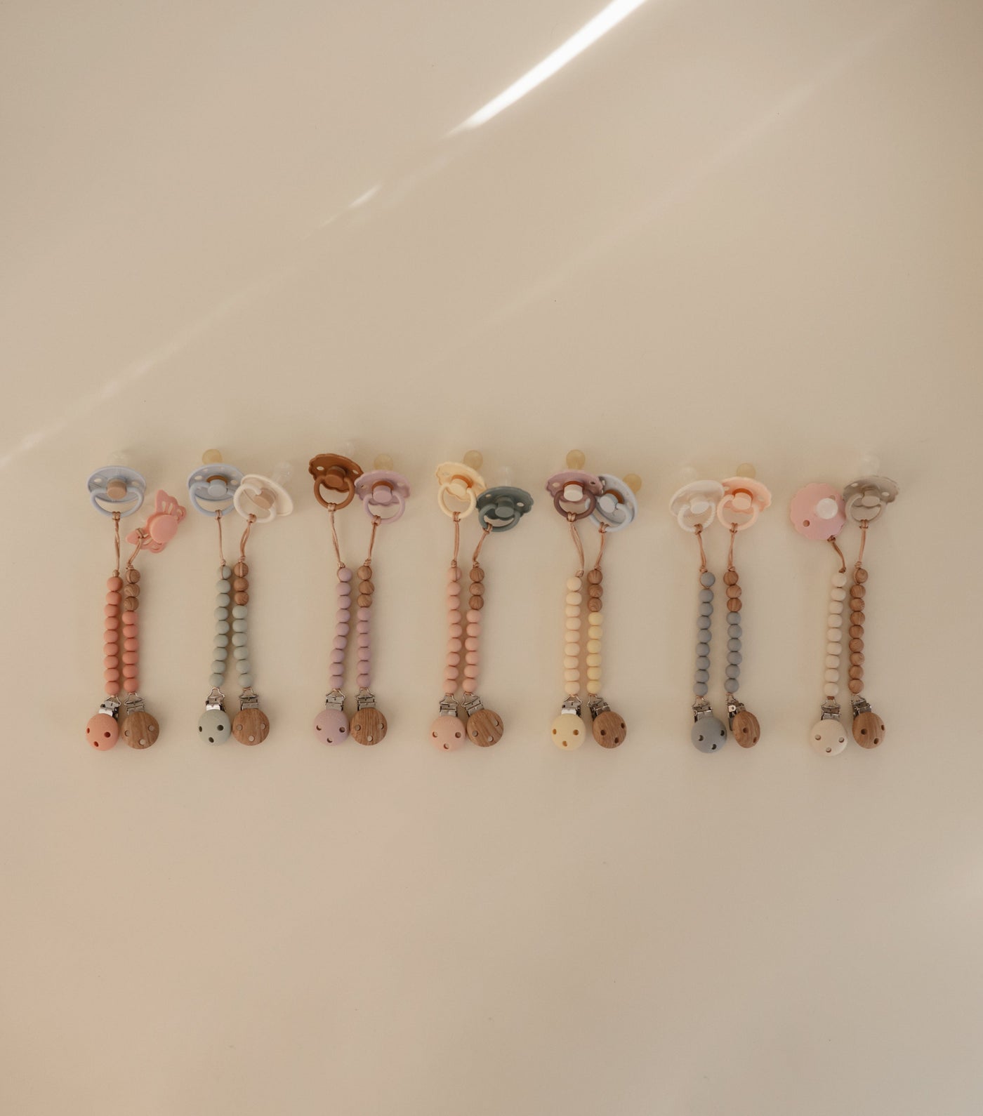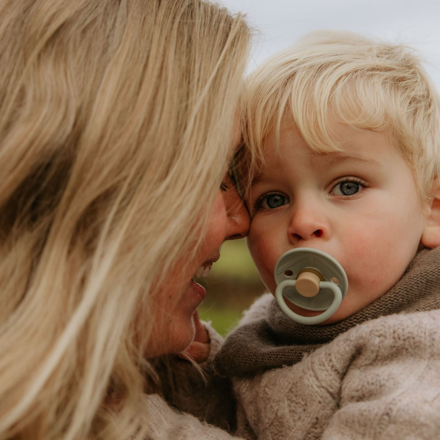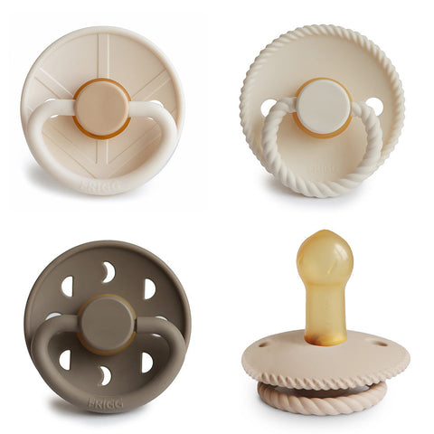 FRIGG rubber pacifiers are thoughtfully designed and made in Denmark for your baby's comfort and safety with a natural rubber latex nipple and patented Click-Lock® system. The outward curve keeps the pacifier off baby's delicate skin, while air holes and a security handle give parents extra peace of mind. The set includes a variety of four pacifiers in a curated palette—perfect for rotating through the week or gifting to a new parent.