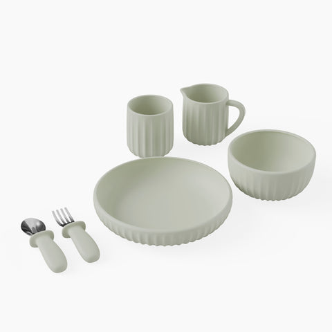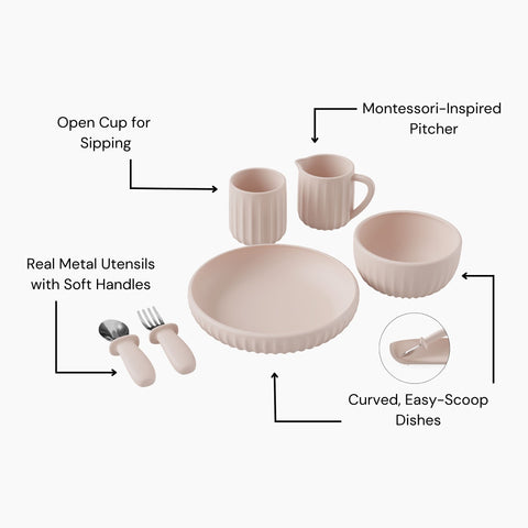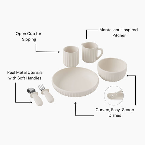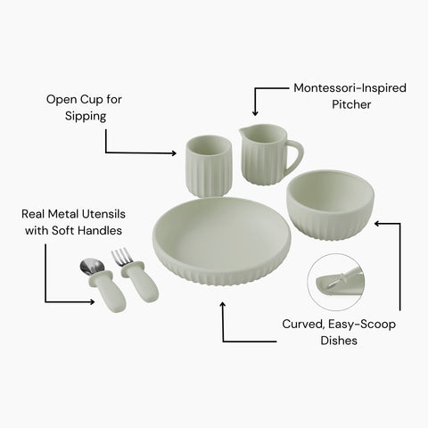 With a plate, bowl, open cup, pitcher, and real metal cutlery included, the Henley Set supports Montessori-style dining and baby-led weaning. By introducing real tools from the start, it encourages confidence and independence in every bite.