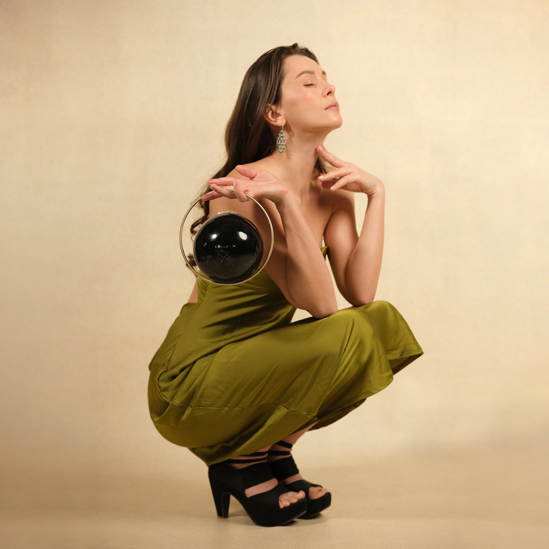 Thoughtfully designed for versatility, the clutch features a secure magnetic closure and a graceful brass ring handle, allowing for multiple styling options. Whether carried by hand or worn over the shoulder, the Midnight Orb Clutch adds a sense of modern luxury to weddings, special events, and elevated everyday occasions alike. Each handcrafted piece is unique, ensuring no two are ever exactly the same.