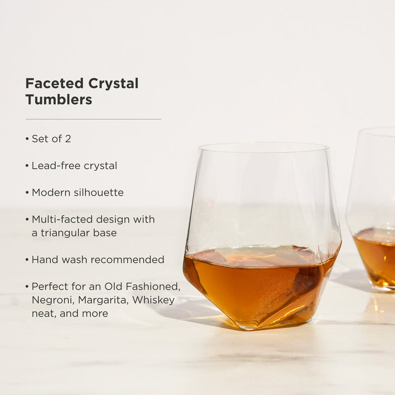 Artful and striking, the Seneca Faceted Crystal Tumblers transform every sip into a visual experience. Beginning with a triangular base that splits into nine angled sides, each glass plays with light to create dazzling reflections across your drink. The geometric design feels contemporary yet timeless, while the smooth rim ensures a comfortable and elegant finish.