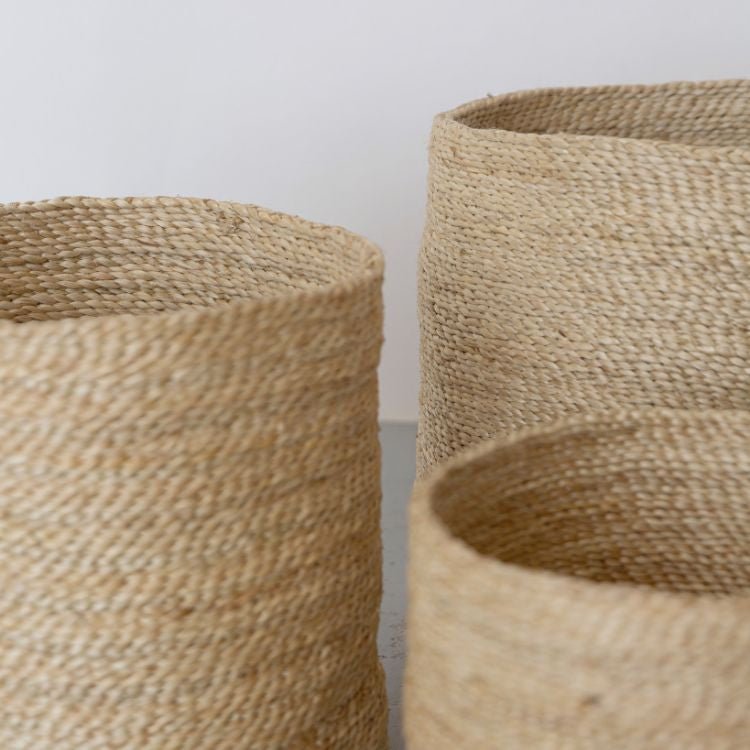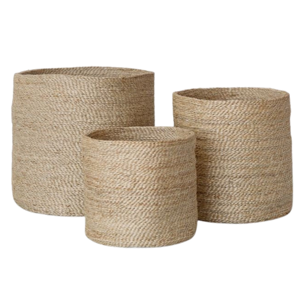 Handwoven from jute, a sustainable natural fiber, each basket showcases unique variations in texture and tone. Their round shape and natural finish make them suitable for a variety of design aesthetics, while the choice of three sizes allows you to display them as a set or select the exact size you need.