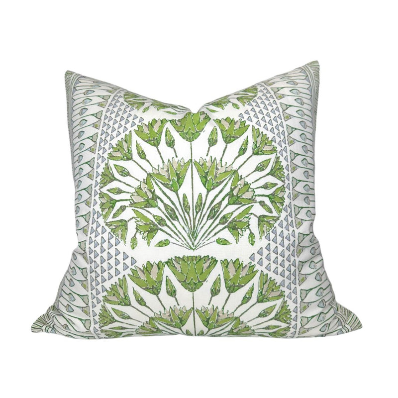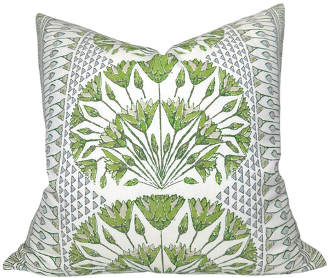 Transform your living space with the Cairo Pillow Cover in Green. This luxurious pillow cover showcases a beautiful printed fabric on the front, complemented by a classic ivory linen fabric on the back, making it a versatile and stylish addition to any room.