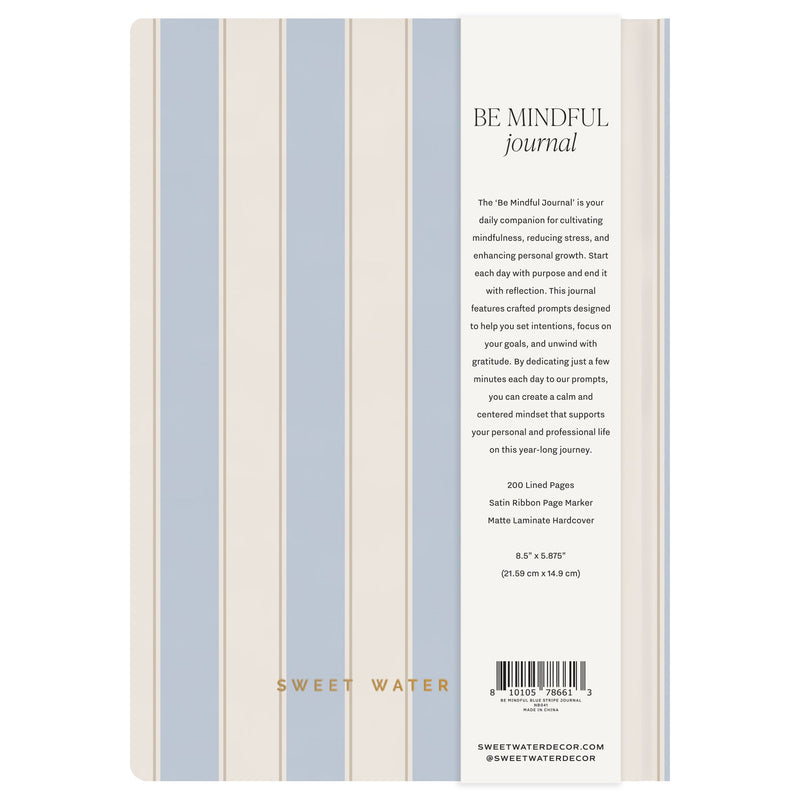 The Be Mindful Striped Journal is a 5-minute prompted journal designed to help you reflect, reset, and focus each day. With simple daily prompts, it creates space to record your goals, achievements, and memories, making mindfulness an easy and meaningful habit.