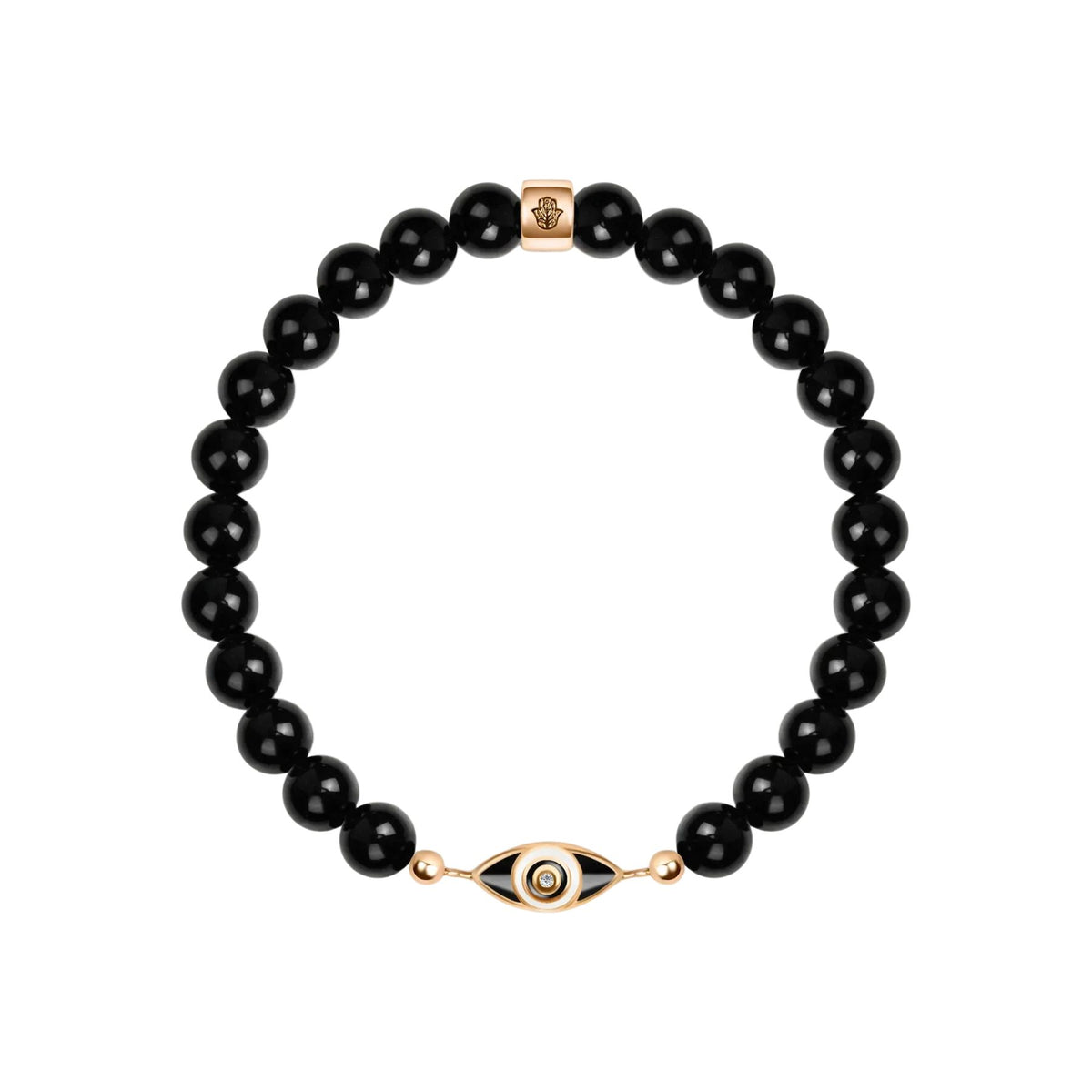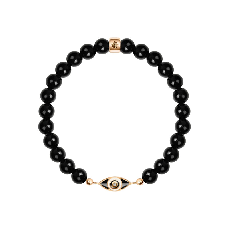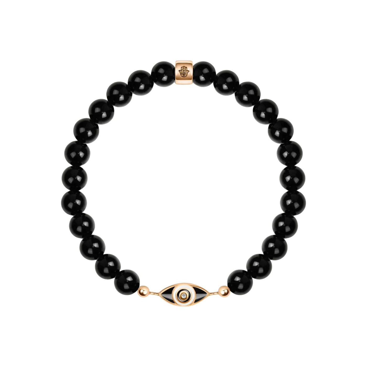 Handcrafted with 18K gold-plated 925 sterling silver, this bracelet is accented with a subtle diamond chip and black enamel for a refined touch. The 7" stretch fit makes it comfortable and versatile, ideal for wearing daily as a protective talisman.