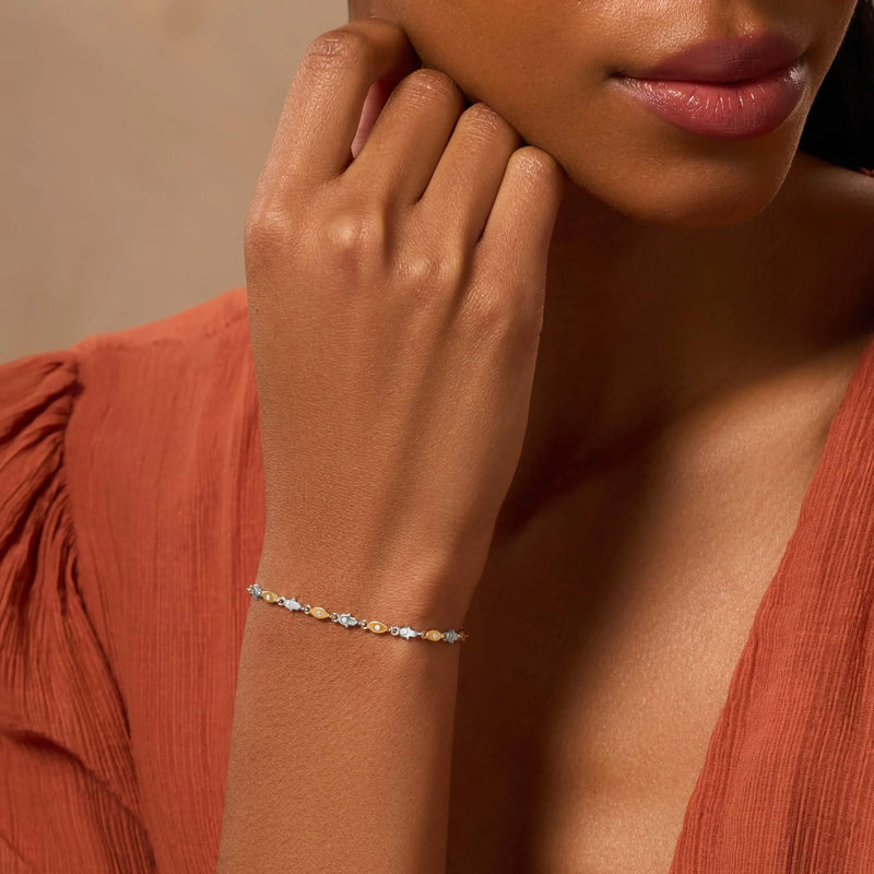 With its 6.5” chain and 1” extender, the Sacred Awakening bracelet provides an adjustable fit that layers beautifully with other jewelry or shines as a subtle stand-alone piece. Designed with contrasting metals, it symbolizes the harmony of duality while keeping protection close at hand.