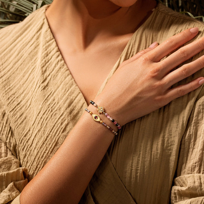 The powerful Evil Eye charm serves as a guardian, protecting you from negativity, misfortune, and malicious intentions. Together, these elements create a talisman of strength, self-confidence, and happiness, helping you stay aligned with your higher self.