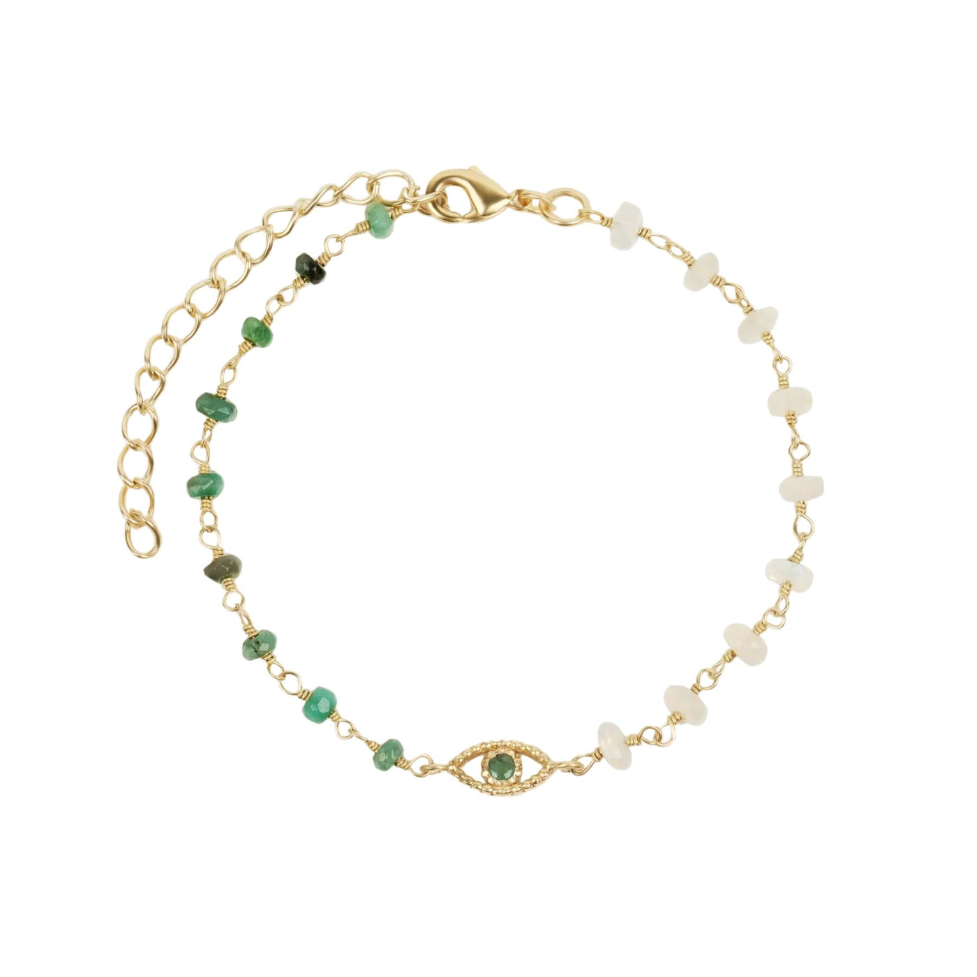 The Soothing Oasis Opal Emerald Evil Eye Charm Bracelet is crafted to bring balance, vitality, and protection into your everyday life. White Ethiopian opal stones channel intuition, healing, and emotional clarity, while lush emerald beads symbolize vitality, compassion, and abundance. At its center, the Evil Eye charm provides timeless protection, deflecting negativity and creating a shield of peace.