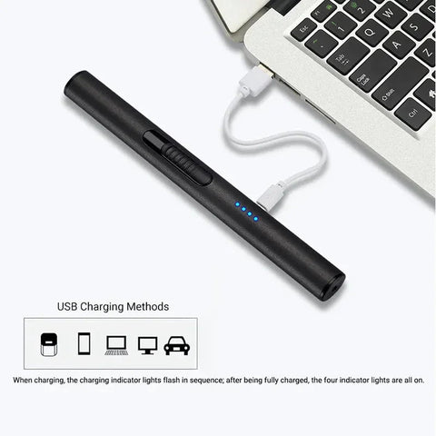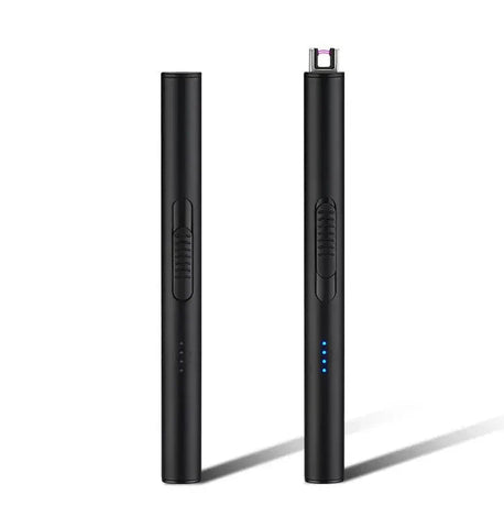 The Black Flameless Candle Lighter offers a modern, eco-friendly way to light candles and more. Designed in matte black with brushed gold accents, this rechargeable lighter uses plasma arc technology for a clean, windproof spark without flame or fuel.