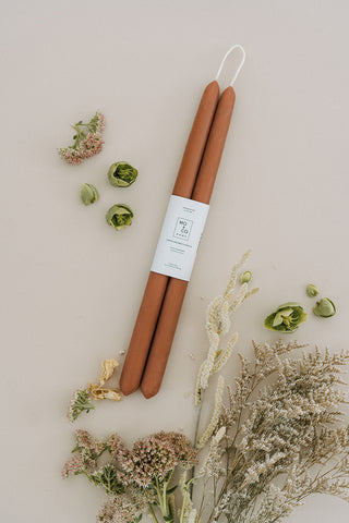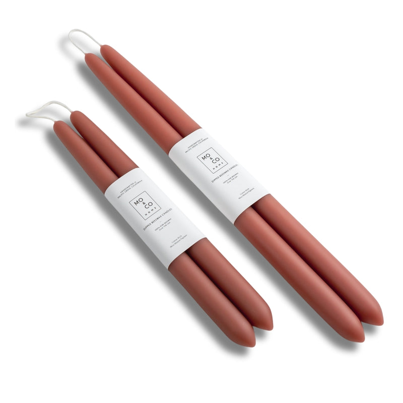 Add a warm, earthy touch to your space with the Terra Cotta Dipped Beeswax Taper Candles from Mo&Co Home. Handcrafted using 100% pure beeswax and natural cotton wicks, each candle is meticulously dipped over 25 times to create a smooth, richly colored finish inspired by natural clay tones.