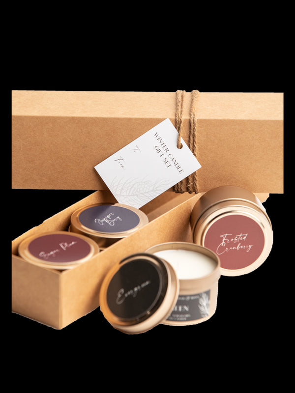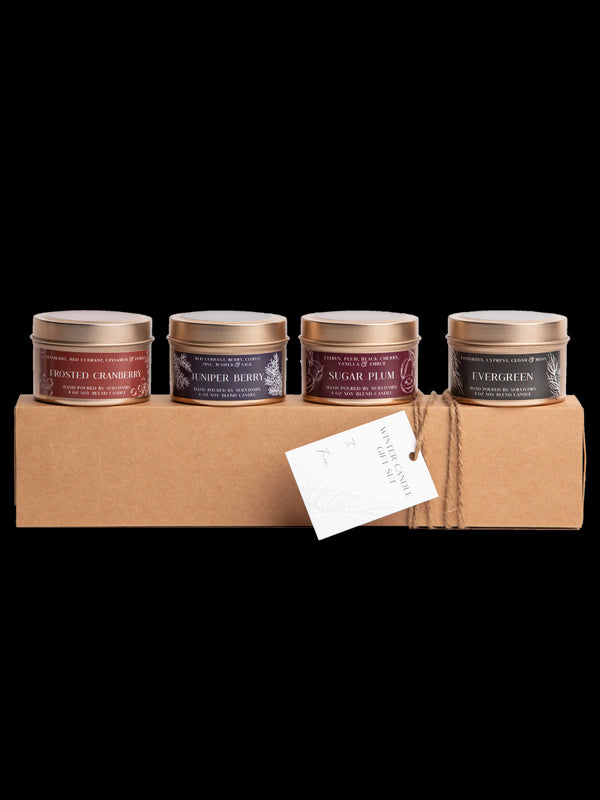 Bring the magic of the season into your home with the Winter Candle Gift Set. This curated collection includes four festive scents—Frosted Cranberry, Juniper Berry, Sugar Plum, and Evergreen—each capturing the cozy spirit of winter. Perfect for gifting or enjoying yourself, these candles add warmth and charm to every gathering and quiet evening alike.