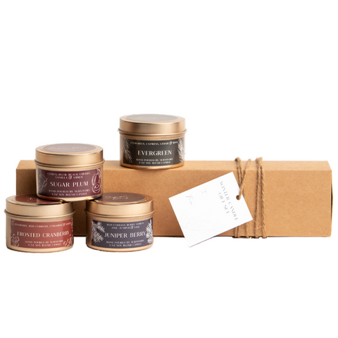Hand-poured into 4 oz travel tins, each candle is made with a soy wax blend, clean-burning cotton wicks, and phthalate-free fragrance oils. Beautifully packaged as a set, they’re ready to brighten holiday traditions, add sparkle to seasonal décor, or serve as thoughtful gifts. Every candle is crafted with purpose by women survivors, making this set as meaningful as it is memorable.