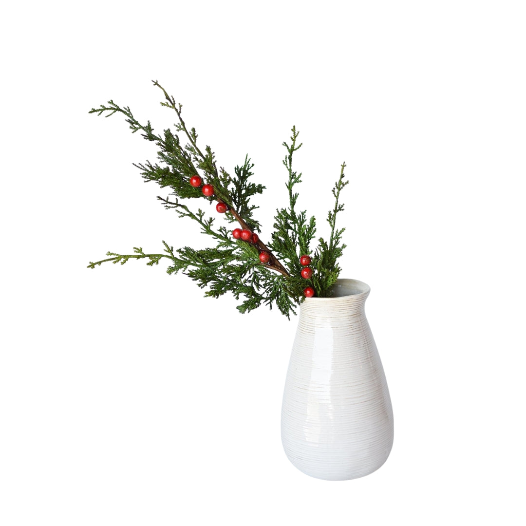 A perfect blend of classic greenery and festive color, this 24" Faux Cedar Spray with Red Berries adds beautiful depth and texture to your seasonal arrangements. Featuring lifelike cedar branches paired with bright red foam berries (encased in a plastic shell), this stem brings a timeless holiday touch to vases, wreaths, garlands, or tabletop décor.