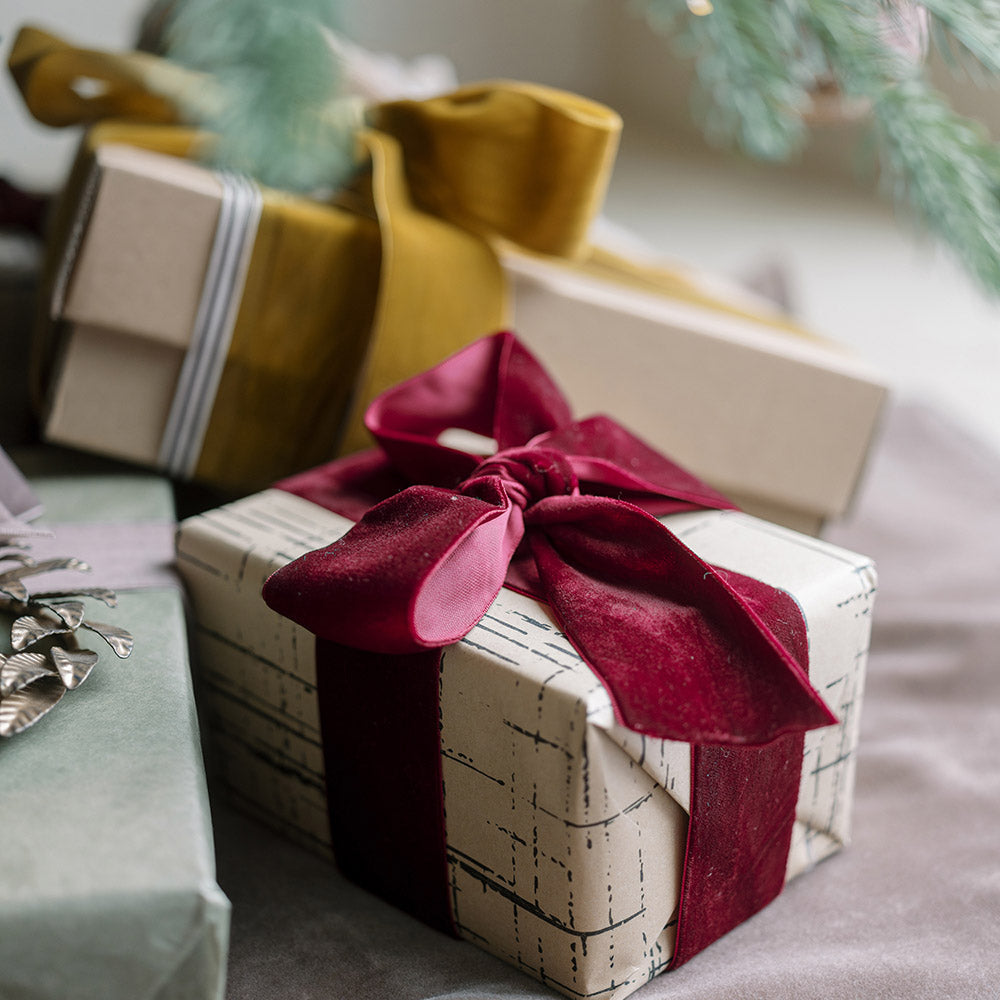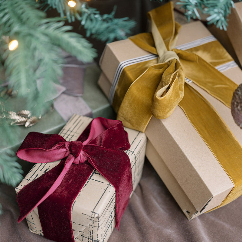 Each spool is carefully hand dyed, giving the velvet its plush texture and artisanal character. Neatly wound on handmade wooden spools, this ribbon is as decorative in storage as it is in use. Whether you’re tying up napkins for a holiday dinner, adorning a Christmas tree, or adding the finishing touch to a thoughtful gift, this ribbon makes every detail memorable.