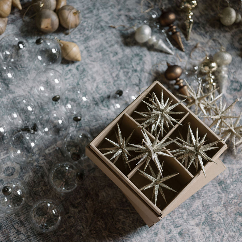 Radiant sparkle, timeless glamour. Our Gold Glitter Starburst Ornaments are designed to shine bright and elevate your holiday décor with dazzling brilliance. Each 6-inch ornament captures the magic of the season, adding depth, light, and a hint of luxury wherever you place them.