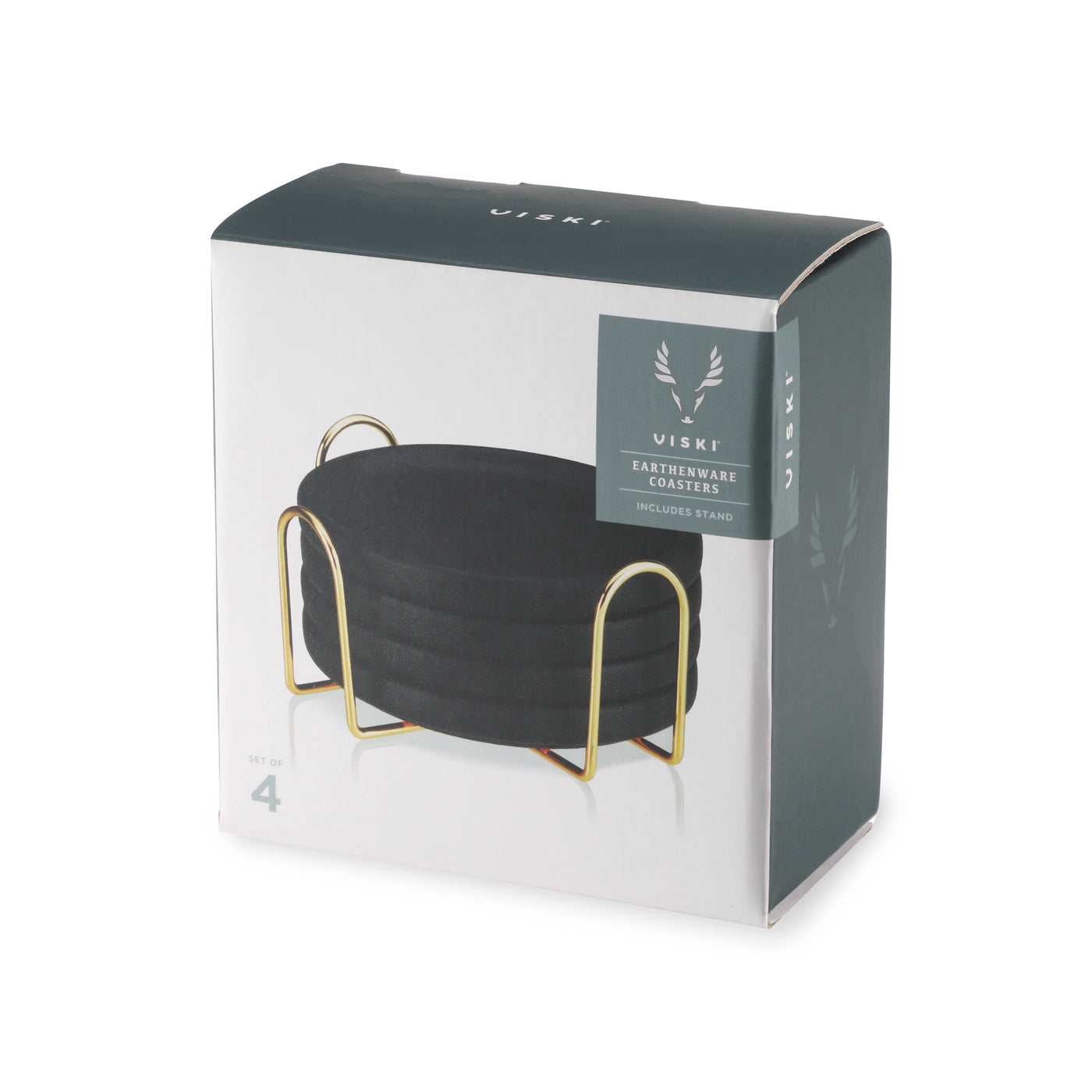 The Earthenware Coasters with Stand Set of 4 combines sleek design with practical function. Crafted in black earthenware with raised rims to help prevent spills, these modern coasters are as stylish as they are useful.