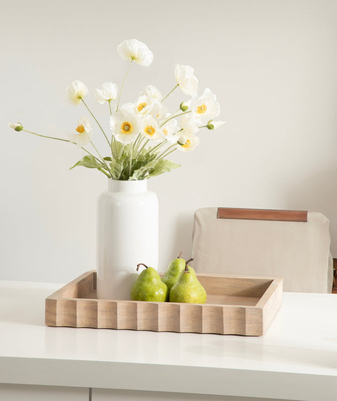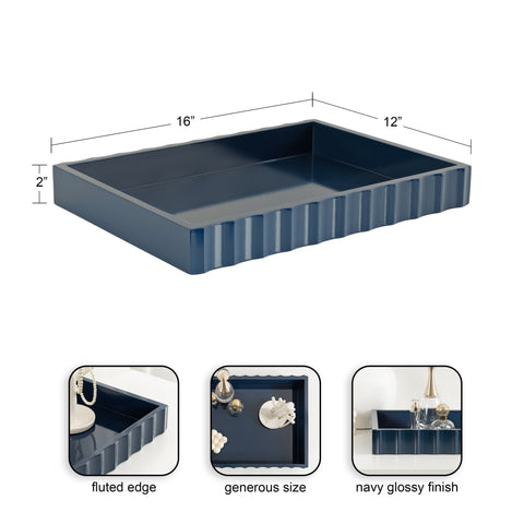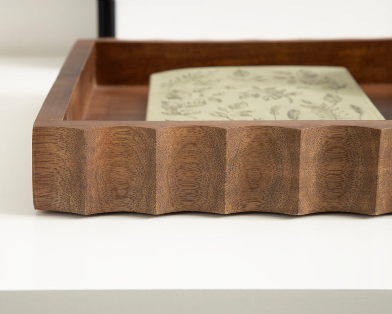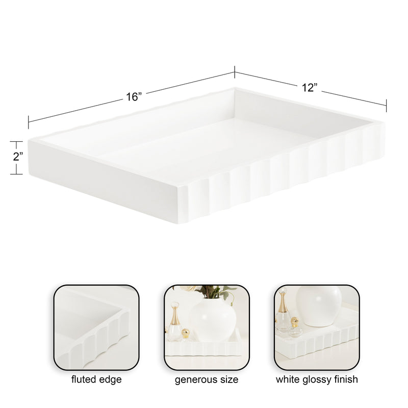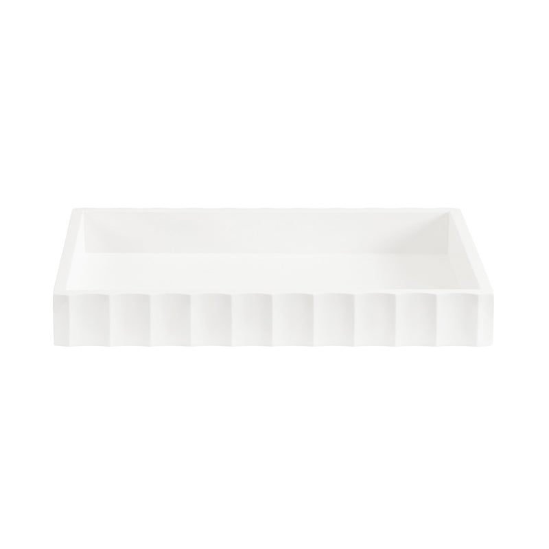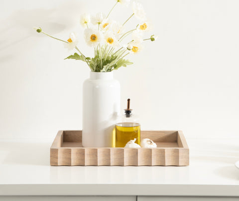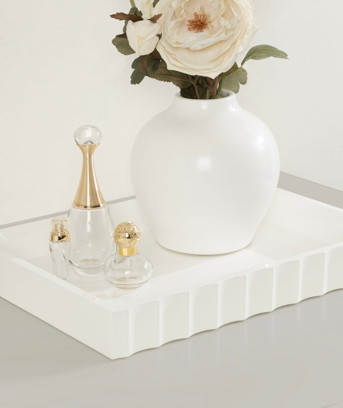The Lissi Rectangle Tray brings contemporary flair and versatile functionality to your home. With its sleek fluted design and wavy edge, this tray offers both style and practicality. It’s perfect for organizing your keys and change on an entrance console, serving as a decorative accent on your ottoman for beverages, or even organizing your makeup on a vanity.