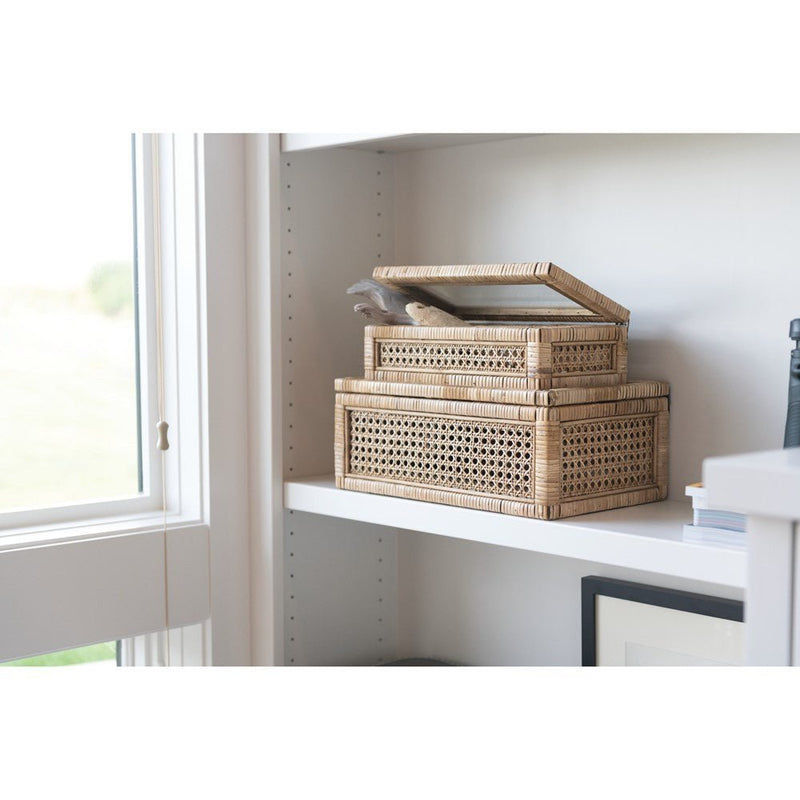 Woven Rattan & Wood Display Boxes with Glass Lid, Set of 2