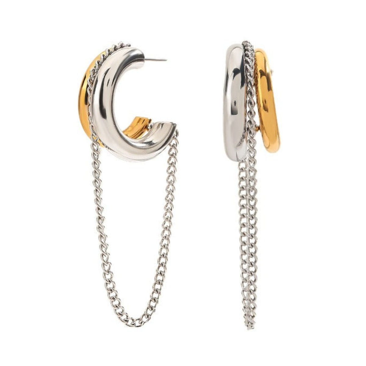 Turn heads with the Blaine Two Tone Chain Hoop Earrings, a daring fusion of sleek style and modern edge. Featuring two chic hoops connected by a delicate chain, these earrings bring movement, attitude, and sophistication to any outfit.