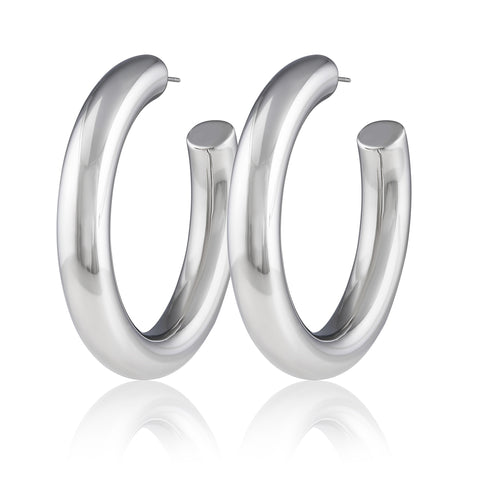 Make a sleek statement with the Tubular Hoops, designed with bold curves and a polished finish that instantly elevates any look. Crafted in silver plating over durable stainless steel, these oversized hoops strike the perfect balance between modern edge and timeless elegance.
