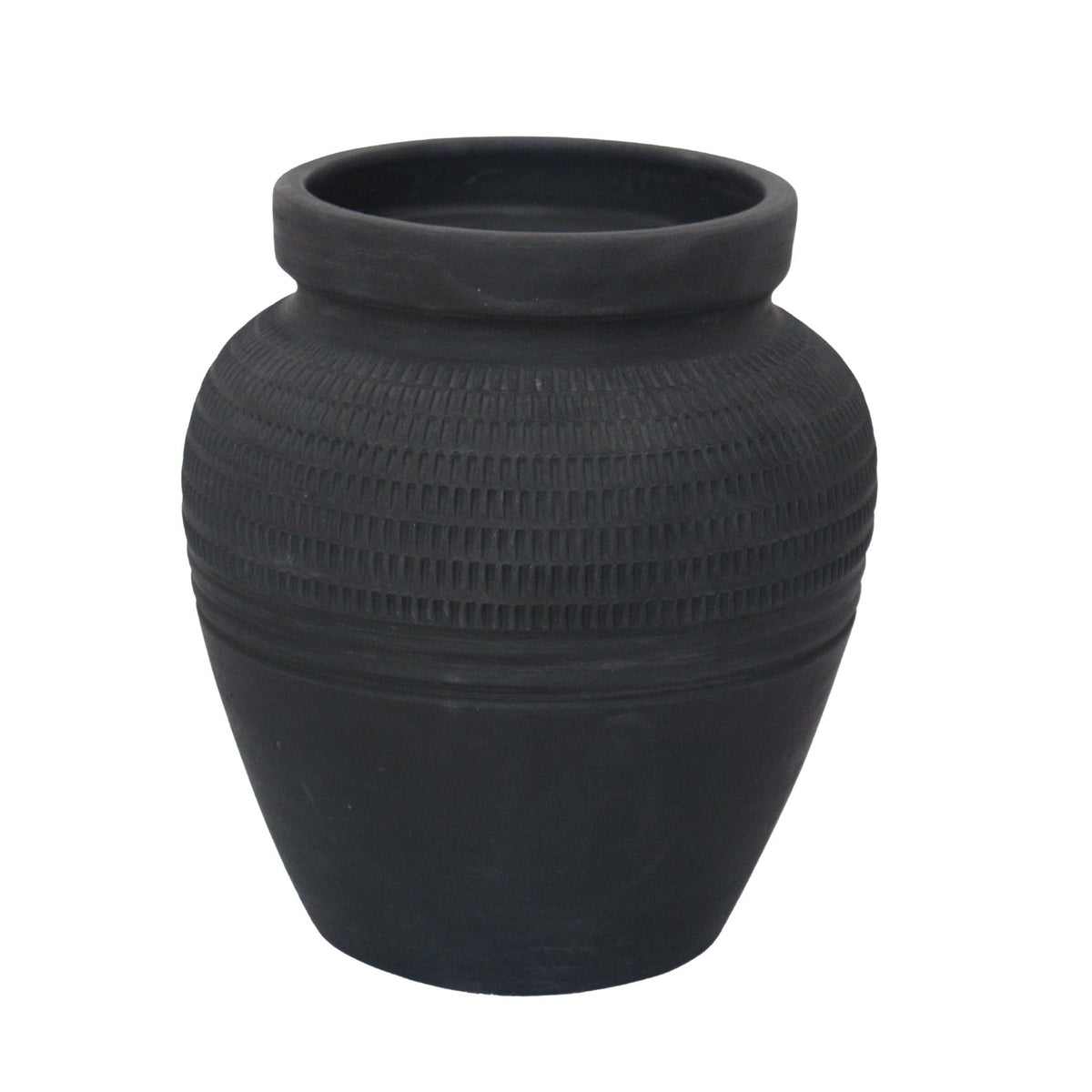 Add bold sophistication to your home décor with this handcrafted 11" black terracotta vase, made in India. Its sleek matte finish enhances the natural terracotta texture, creating a striking contrast that blends seamlessly with both contemporary and minimalist interiors.
