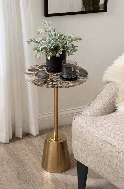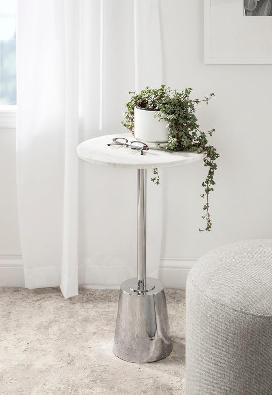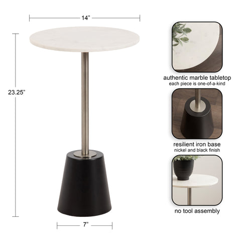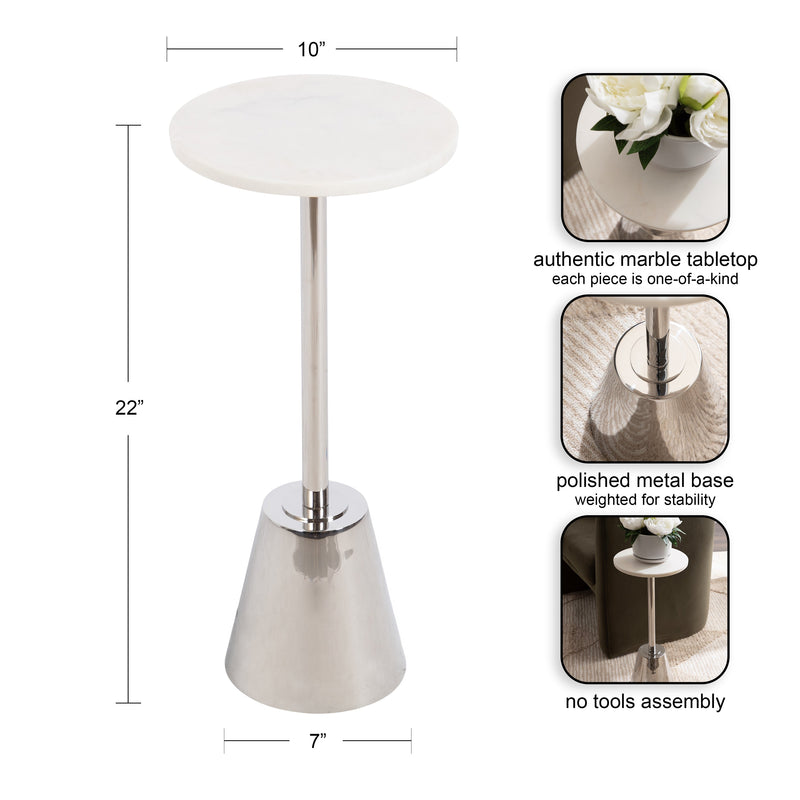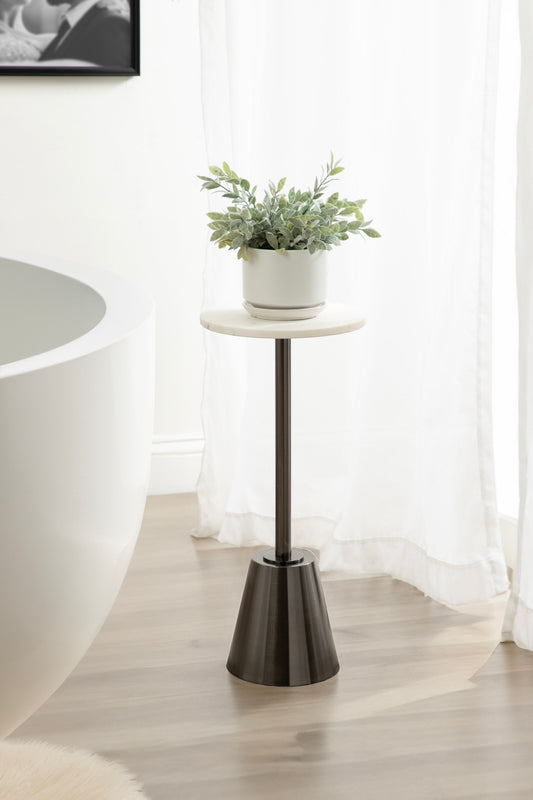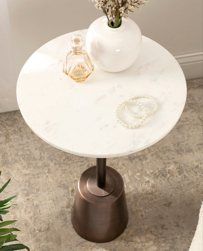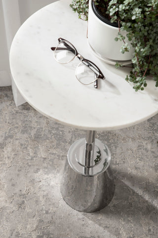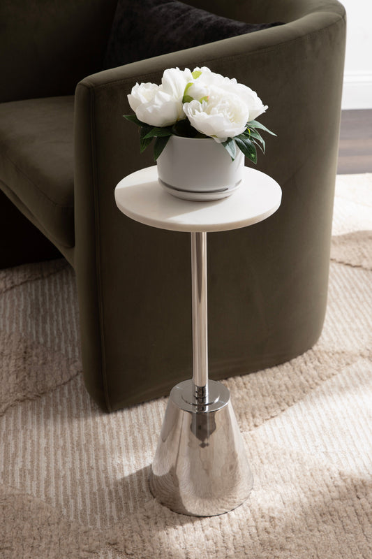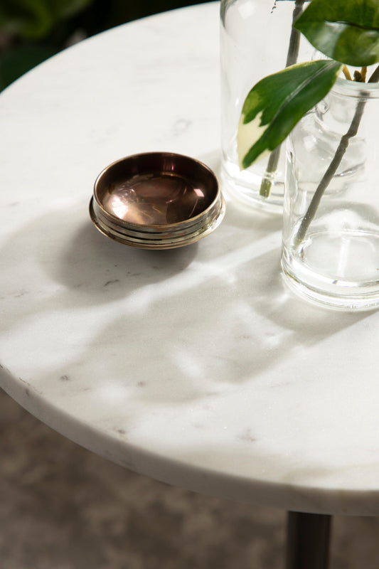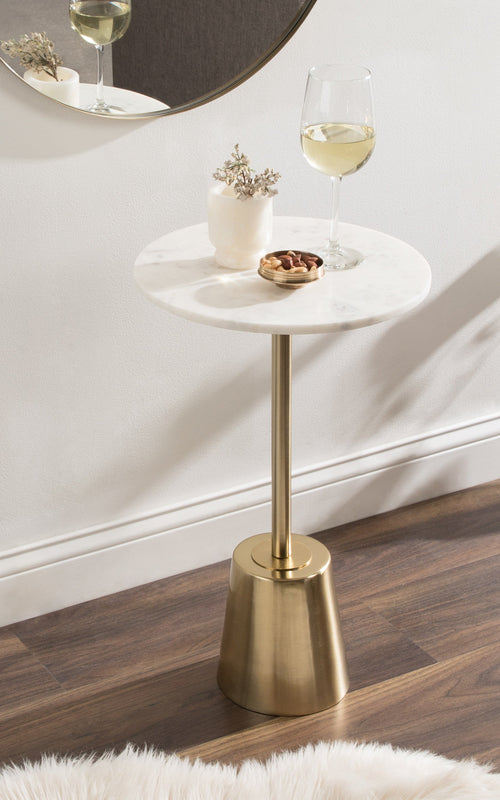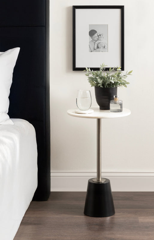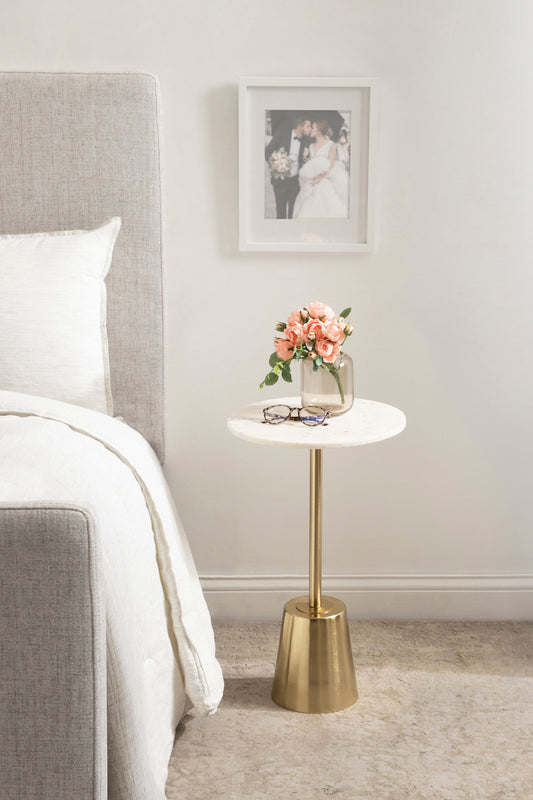 The Tira Round Marble and Metal Side Table exudes modern luxury with its striking combination of marble and metal finishes. This chic drink table is designed to offer both style and functionality, making it an ideal piece for serving drinks or displaying small decorative accents. Its compact round shape ensures that it fits seamlessly into any room, whether beside your sofa, in a cozy reading nook, or next to your bed.
