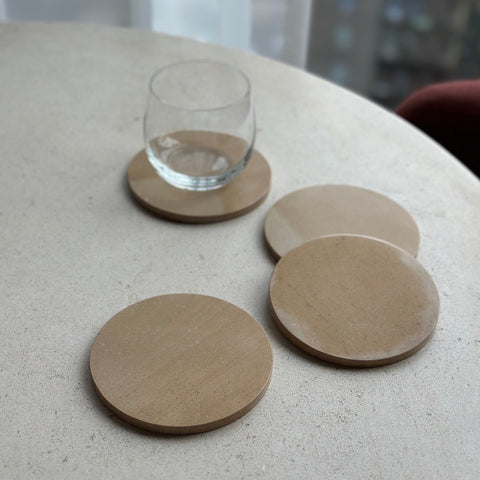 Generous in scale—the Oversized Coasters are a set of four stone rounds designed for the table.