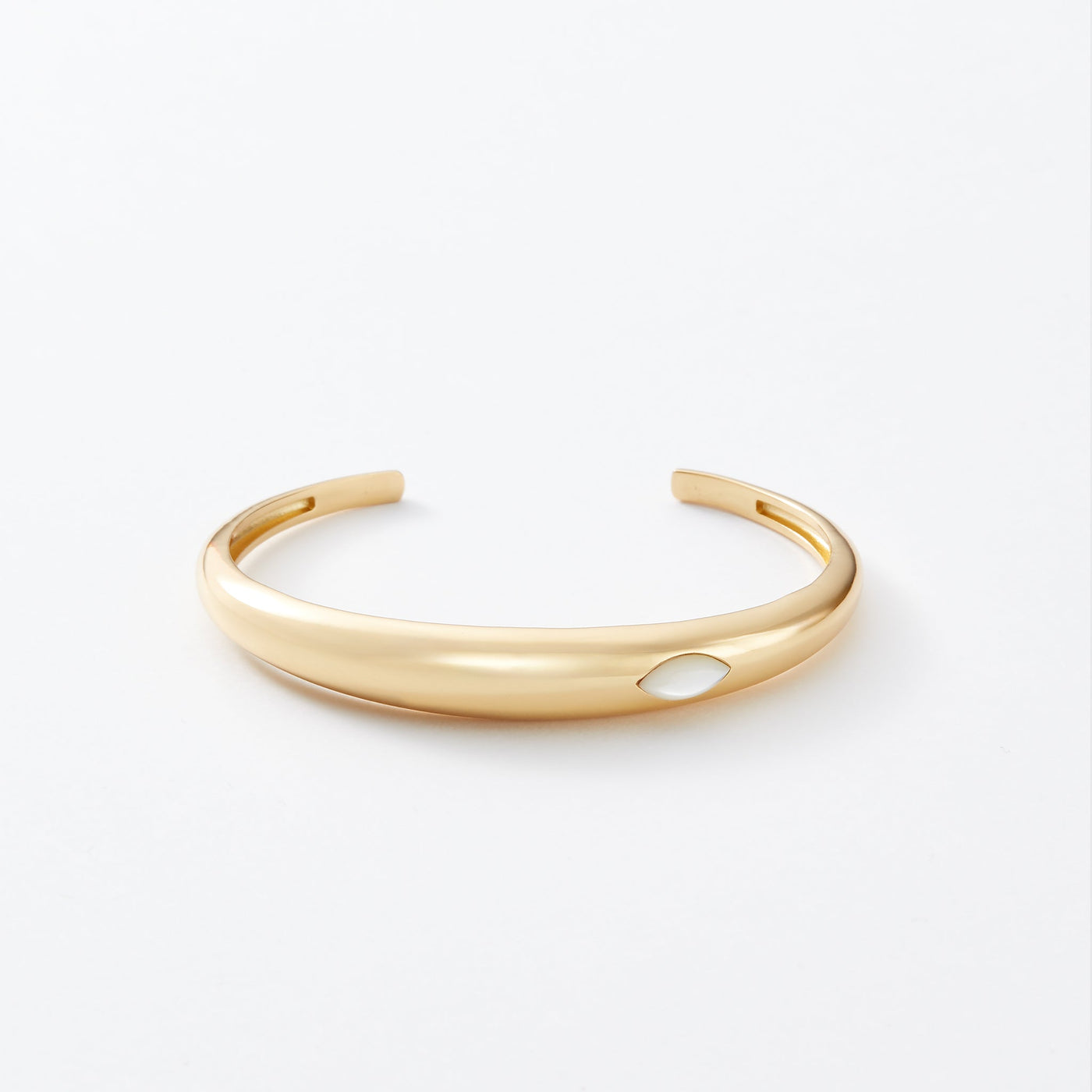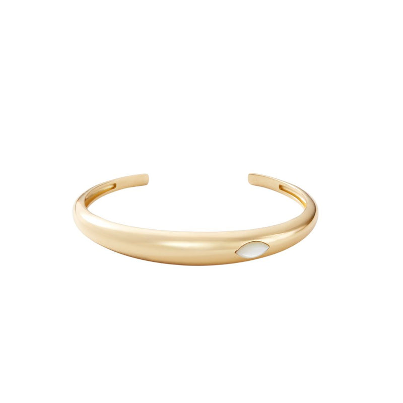 Graceful, sculptural, and softly luminous—the Calla Cuff Bracelet brings an artful balance of strength and delicacy to the wrist. Its smooth domed form feels like a gentle embrace, while the off-center mother of pearl petal introduces a touch of quiet asymmetry that draws the eye. The result is a piece that feels both grounded and ethereal, echoing the serene beauty of a calla bloom.