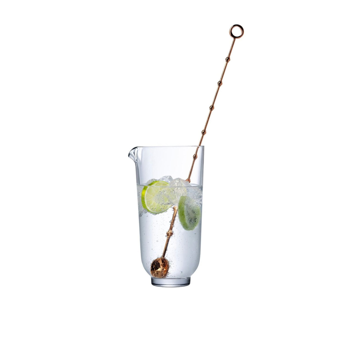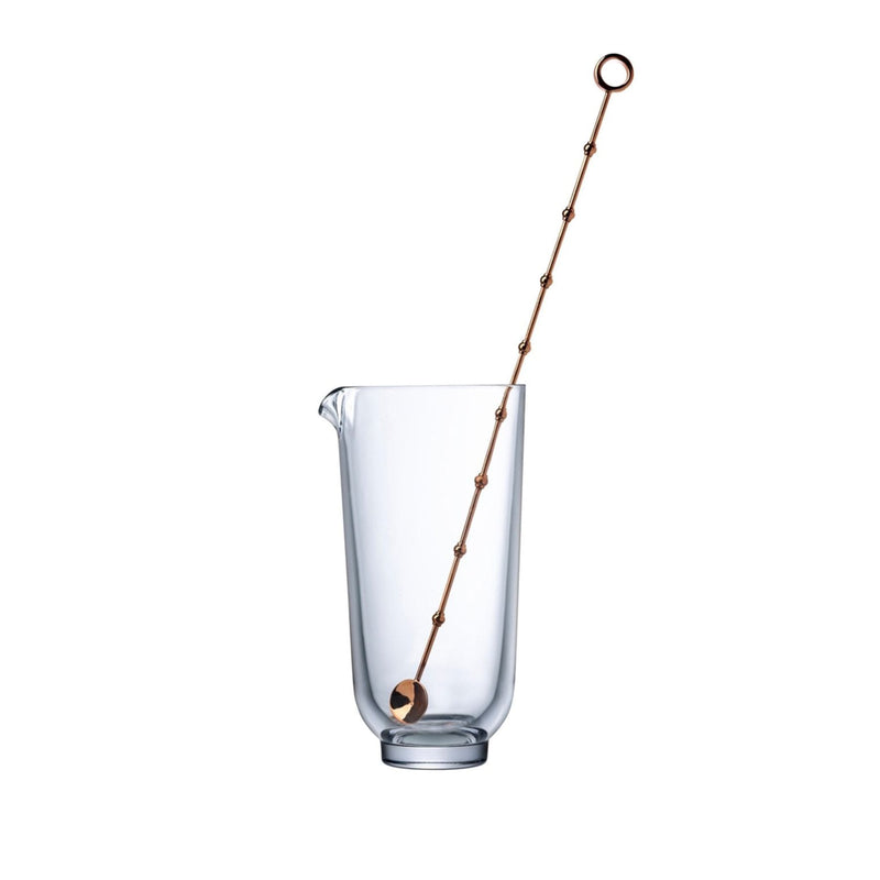 The mixing glass highlights the collection’s signature elegant volumes, offering both clarity and durability for precise mixing. The glossy copper stirrer adds a refined contrast, transforming a simple cocktail ritual into a stylish statement of craft and sophistication.
