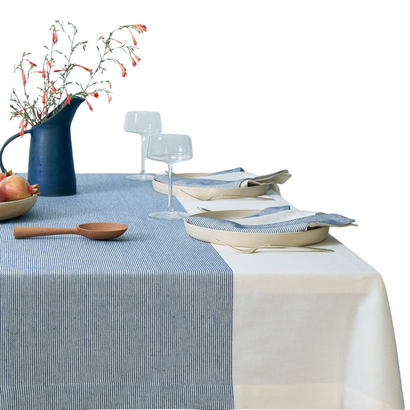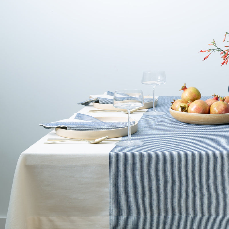 The Stripe Collection Tablecloth in natural cotton with an elderberry center stripe brings subtle color and texture to the dining table. Woven from soft, washed cotton, it creates a warm foundation that frames meals, conversations, and gatherings beautifully.