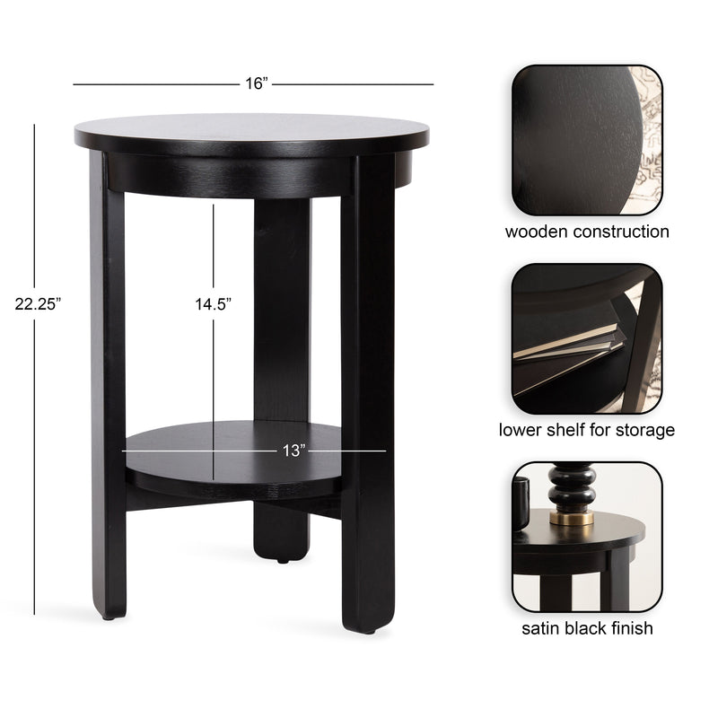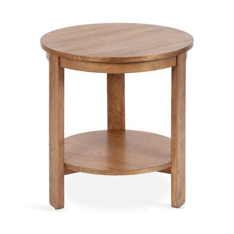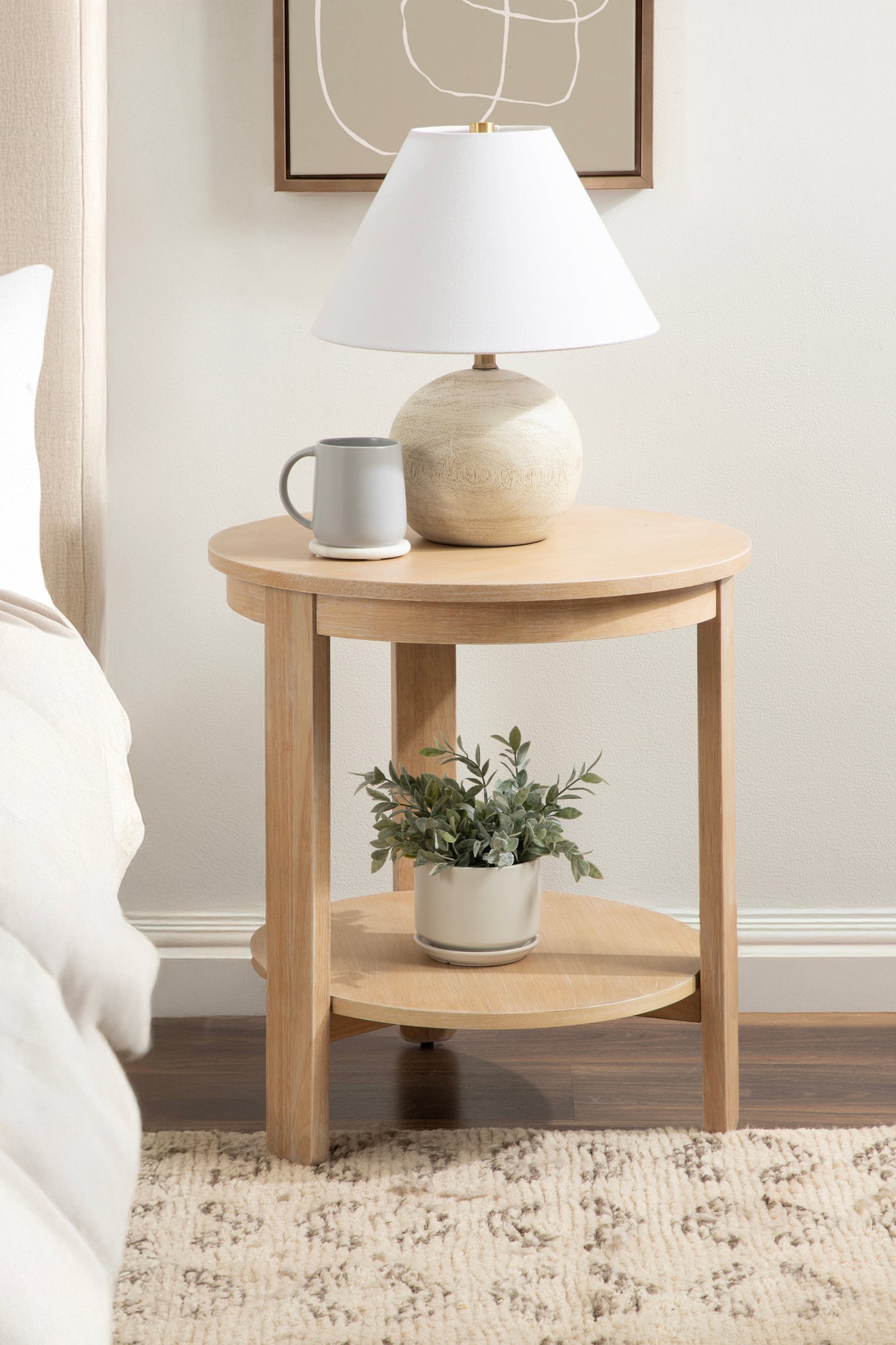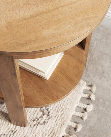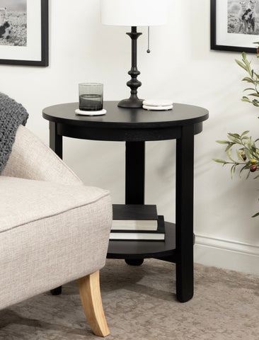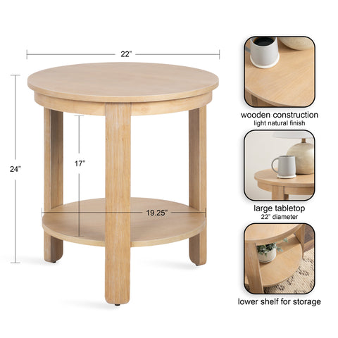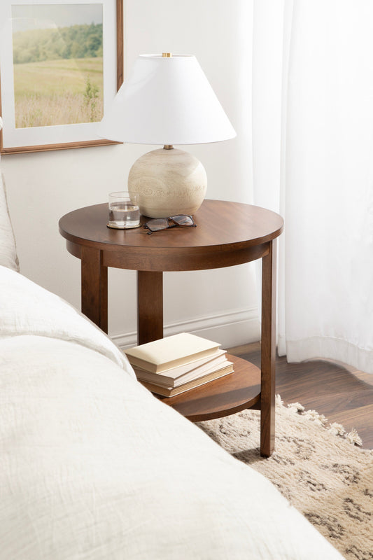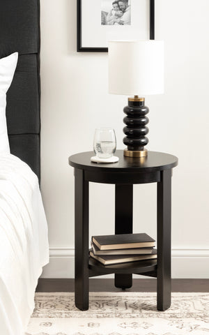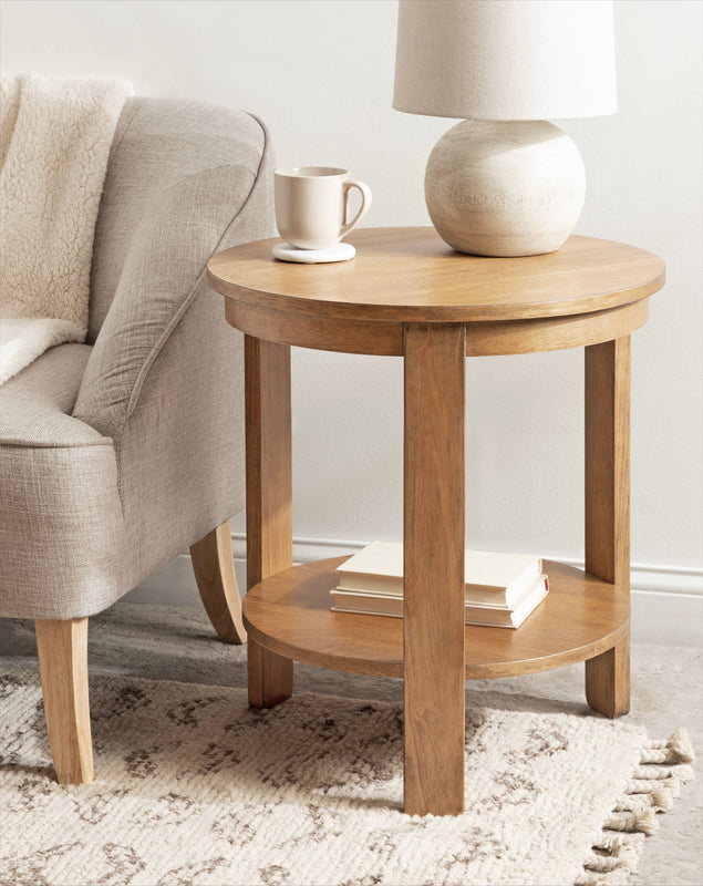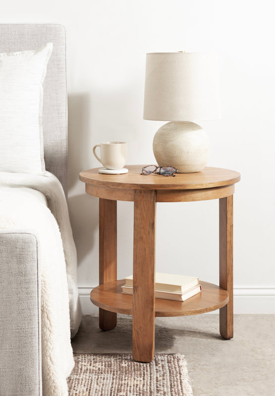 The Foxford Round Wood Side Table is a perfect blend of functionality and transitional style, designed to enhance any living space. Crafted from solid wood and resilient materials, this side table brings both beauty and durability to your home. The top tier provides an ideal display area for candles, small lamps, and other decorative accents, while the bottom tier offers ample storage for your household essentials, from cozy blankets to lush faux greenery.