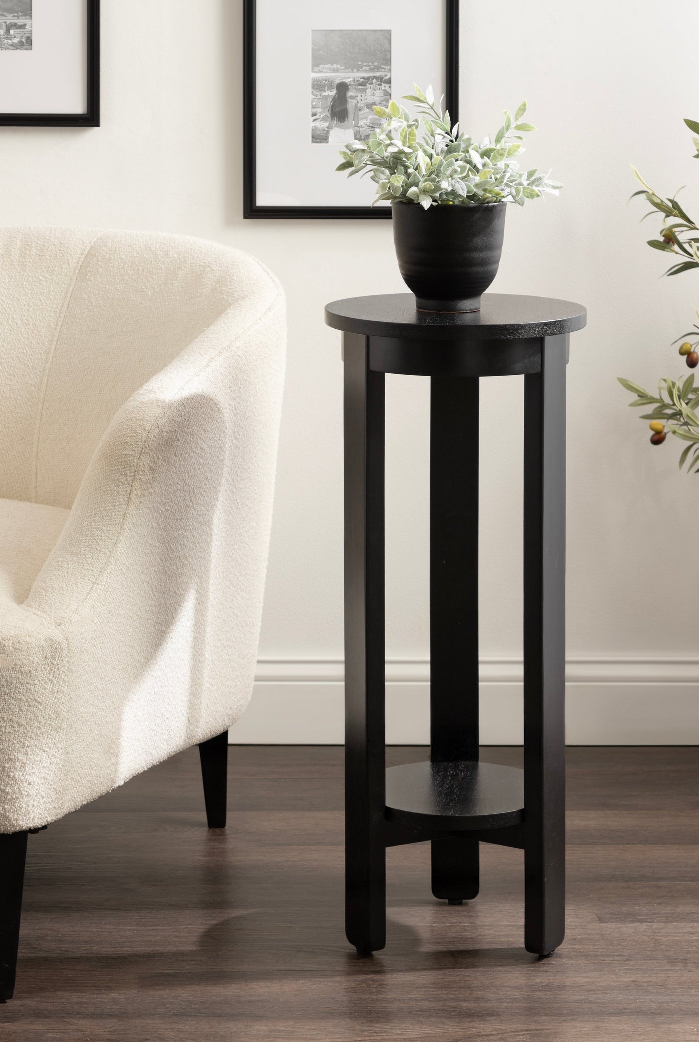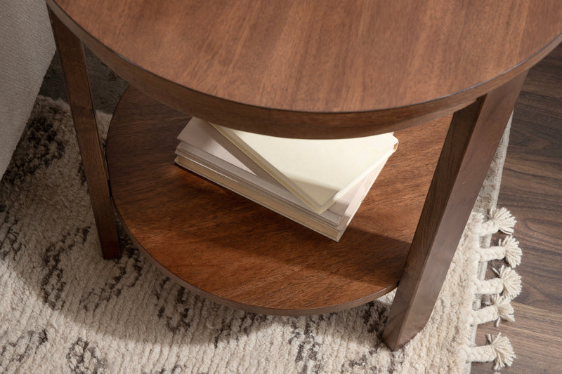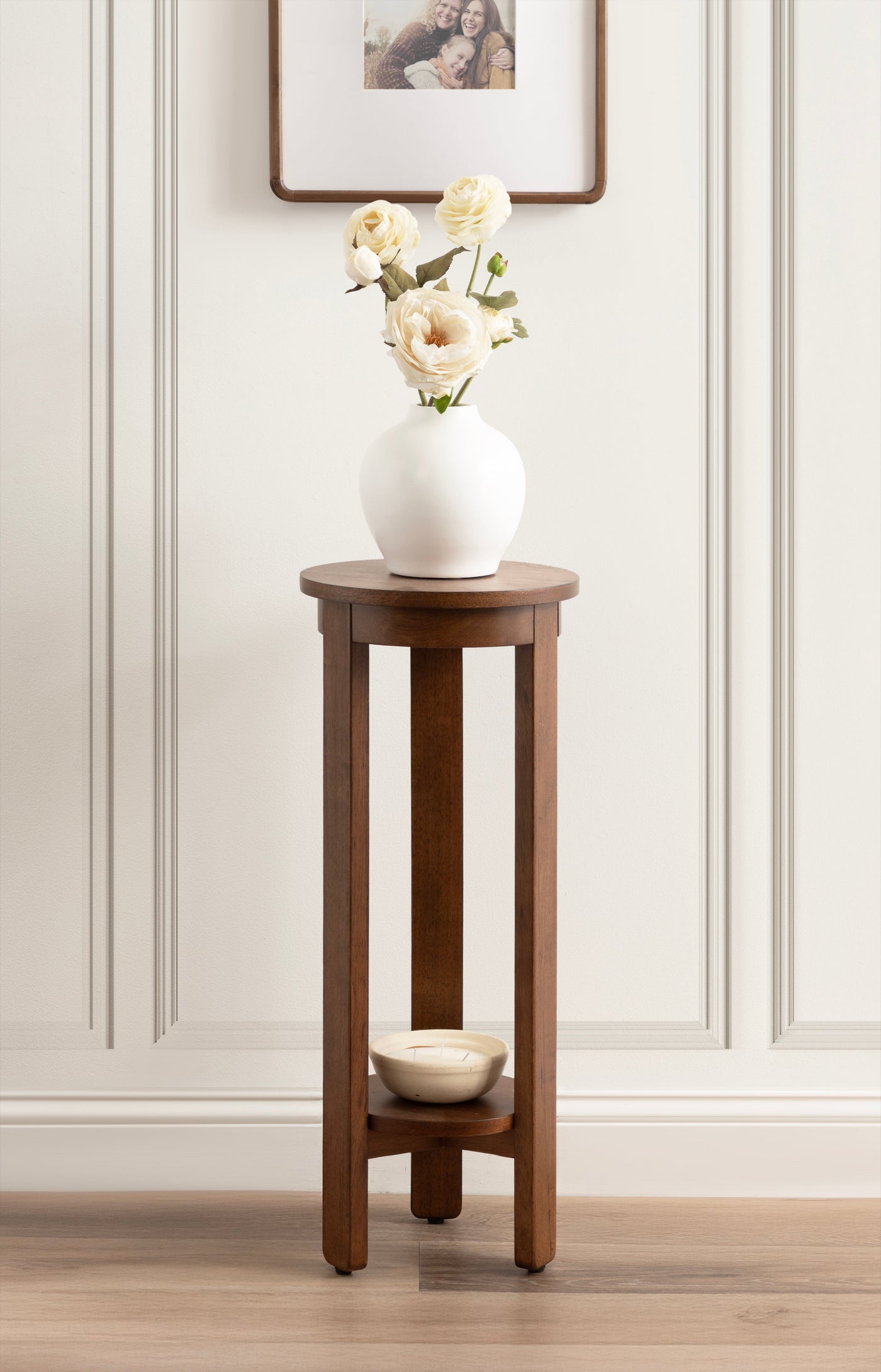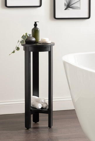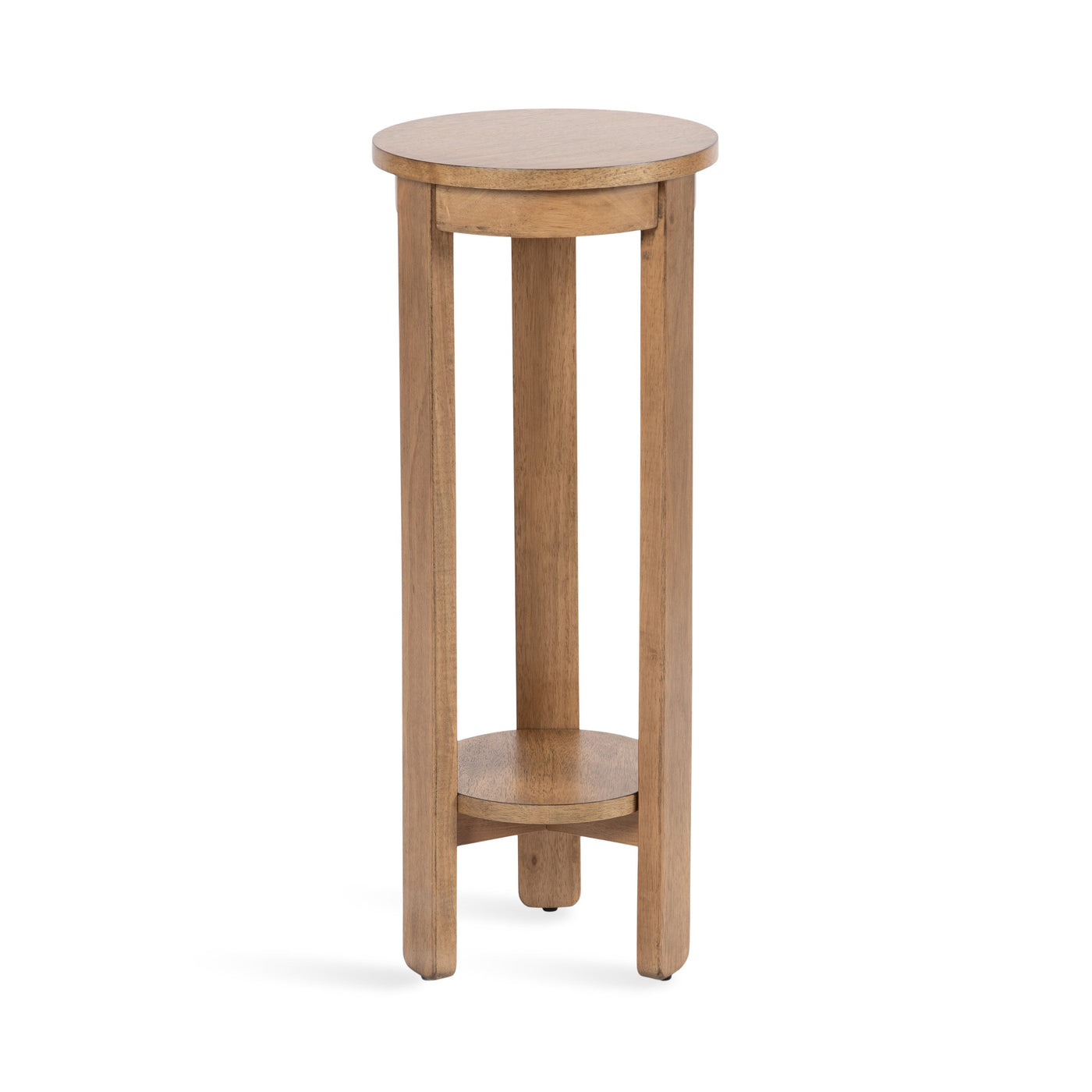 The Foxford Round Wood Side Table is a perfect blend of functionality and transitional style, designed to enhance any living space. Crafted from solid wood and resilient materials, this side table brings both beauty and durability to your home. The top tier provides an ideal display area for candles, small lamps, and other decorative accents, while the bottom tier offers ample storage for your household essentials, from cozy blankets to lush faux greenery.