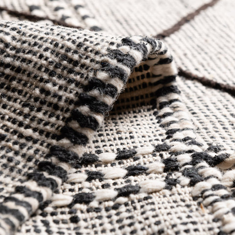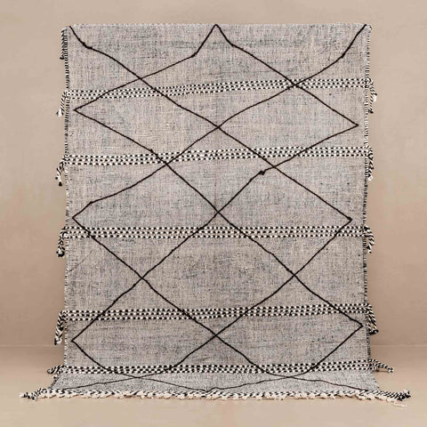 The Chefa rug is a remarkable new kilim woven by the skilled hands of a Taznakht craftswoman in the mountains of Morocco. Handwoven from 100% premium wool, this piece celebrates the centuries-old weaving traditions of the Taznakht tribe—renowned for their lightweight, durable rugs that stand up beautifully to daily life.