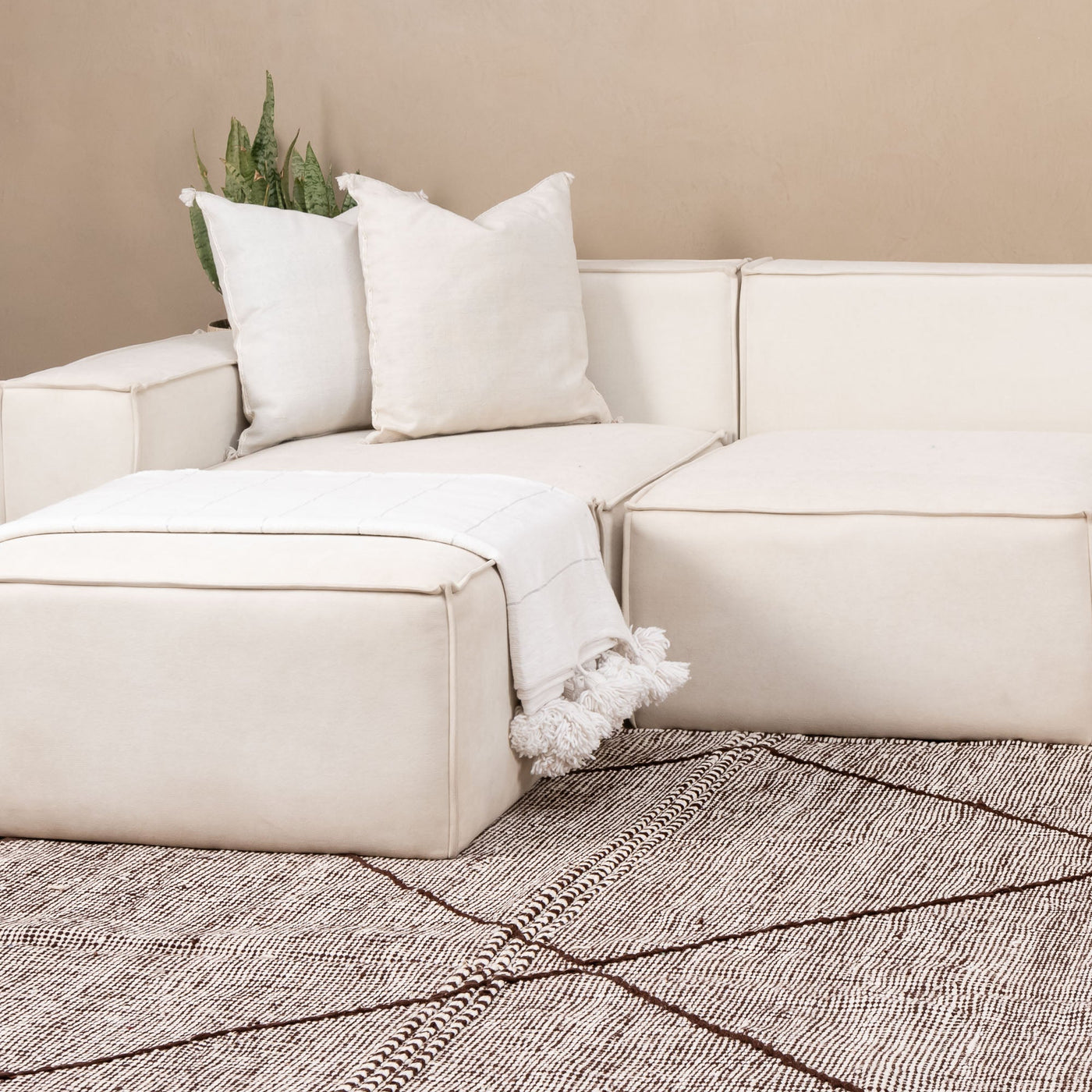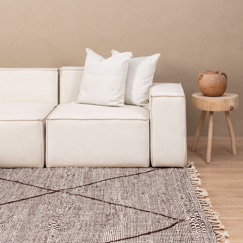 At 91 x 124", Chefa offers generous proportions perfect for a living room, dining area, or bedroom. Its lightweight yet resilient flatweave construction makes it ideal for daily use, while the handmade character ensures that no two pieces are ever alike. Ready to ship within one business day, this rug is not only a design statement but also a direct contribution to sustaining the work of Moroccan craftswomen.