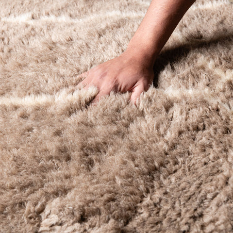 The Earthy Pathways runner rug is a stunning example of Beni Mrirt craftsmanship, woven by skilled artisans with ancestral techniques. Made from 100% prestigious New Zealand wool, this shag rug delivers unmatched softness and durability while offering a modern luxury finish. Its long, narrow design makes it perfect for hallways, entryways, or alongside a bed where its texture and warmth will be felt daily.