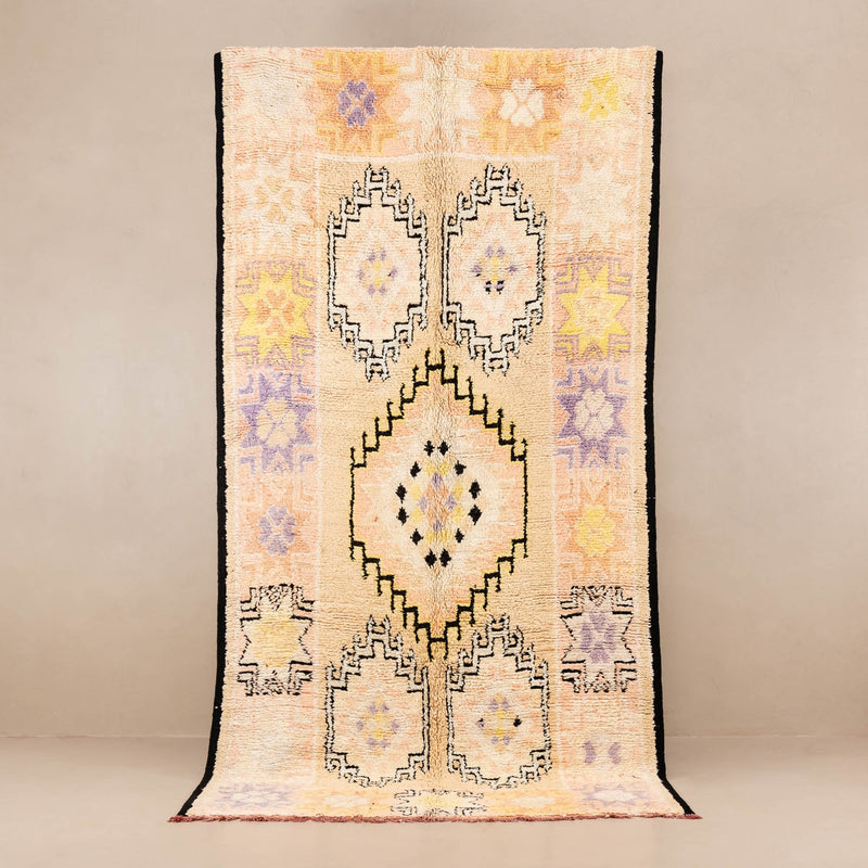 The Yasar rug is a rare and authentic vintage piece, handwoven decades ago by the Boujad tribe in Morocco. Crafted from 100% natural wool, this heirloom carries the history and artistry of generations of skilled women weavers. Its unique character and ancestral know-how only increase in value with time, making it a true collector’s treasure.