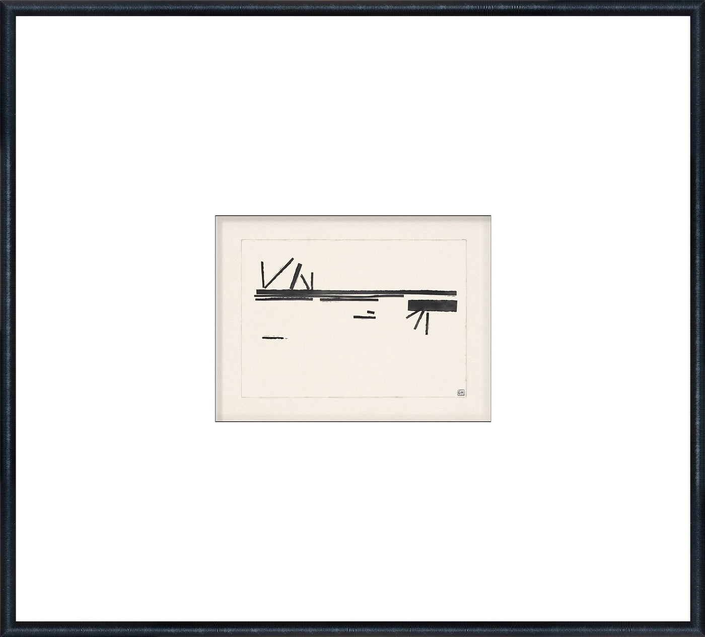 Abstract images created from arrangements of little dark textured shapes on antique paper background. Finished in a textured black frame and a matte with a dark core that creates a bold line around the image.
