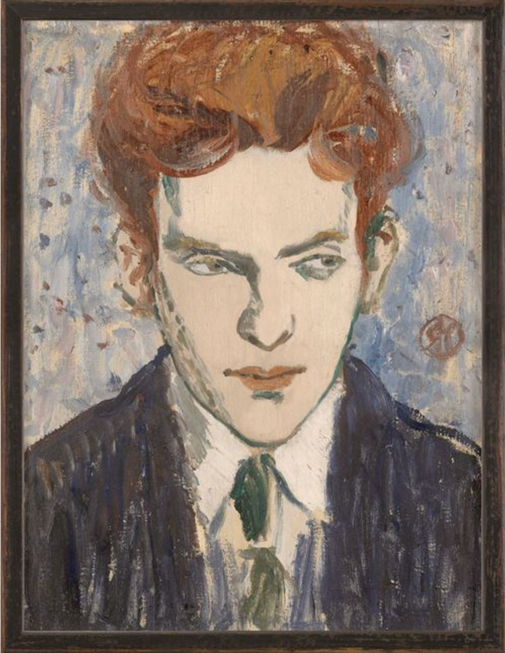 A beautiful, expressive portrait by Raymond McIntyre. Edward’s inquisitive countenance is rendered in textural brushstrokes using mostly cool tones with a shock of red hair. Canvas mounted on board in a distressed walnut and black wood frame.
