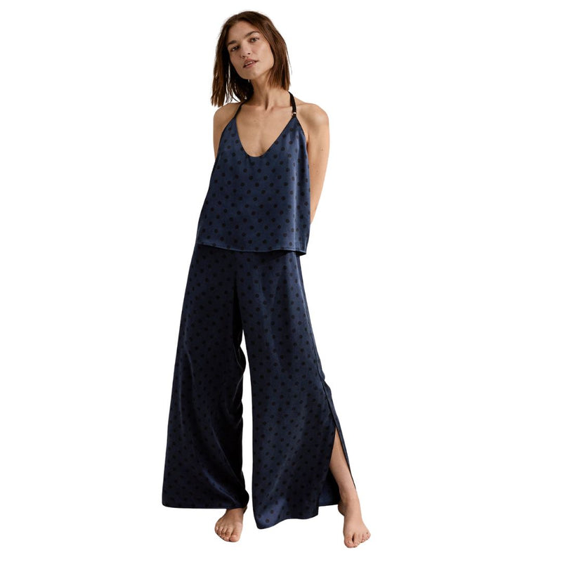 The cami brings ease with adjustable sleek T-back straps, meaning no more slipping, sliding, or constant readjusting. Its relaxed drape floats effortlessly over the body, offering movement without cling. Paired with our signature wide-leg pant, designed with flowy side slits for added ventilation (hello, extra airflow) and complete with functional pockets for everyday practicality, this set earns a permanent spot in your self-care uniform.