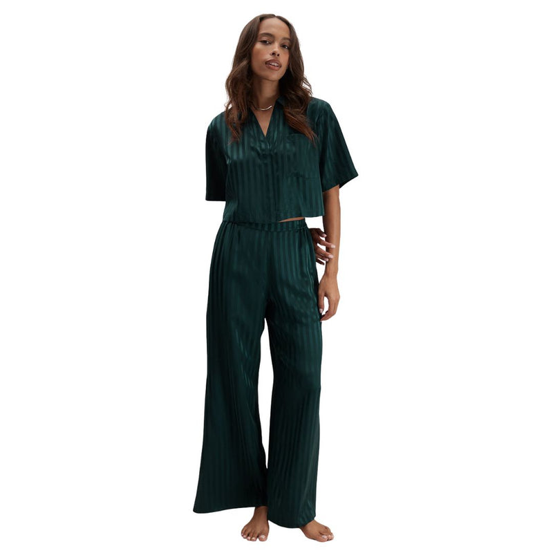 Meet the fan-favorite silk set, now elevated with a subtle woven stripe. The Washable Silk Striped Jacquard High Rise Pant Set pairs a cropped, elbow-length button-down with fluid, wide-leg pants for a look that blends quiet luxury with everyday ease. Crafted from 100% Mulberry Washable Silk, the tonal jacquard texture adds dimension while keeping the fabric weightless, breathable, and naturally thermoregulating—so you stay comfortable through every season of lounging.